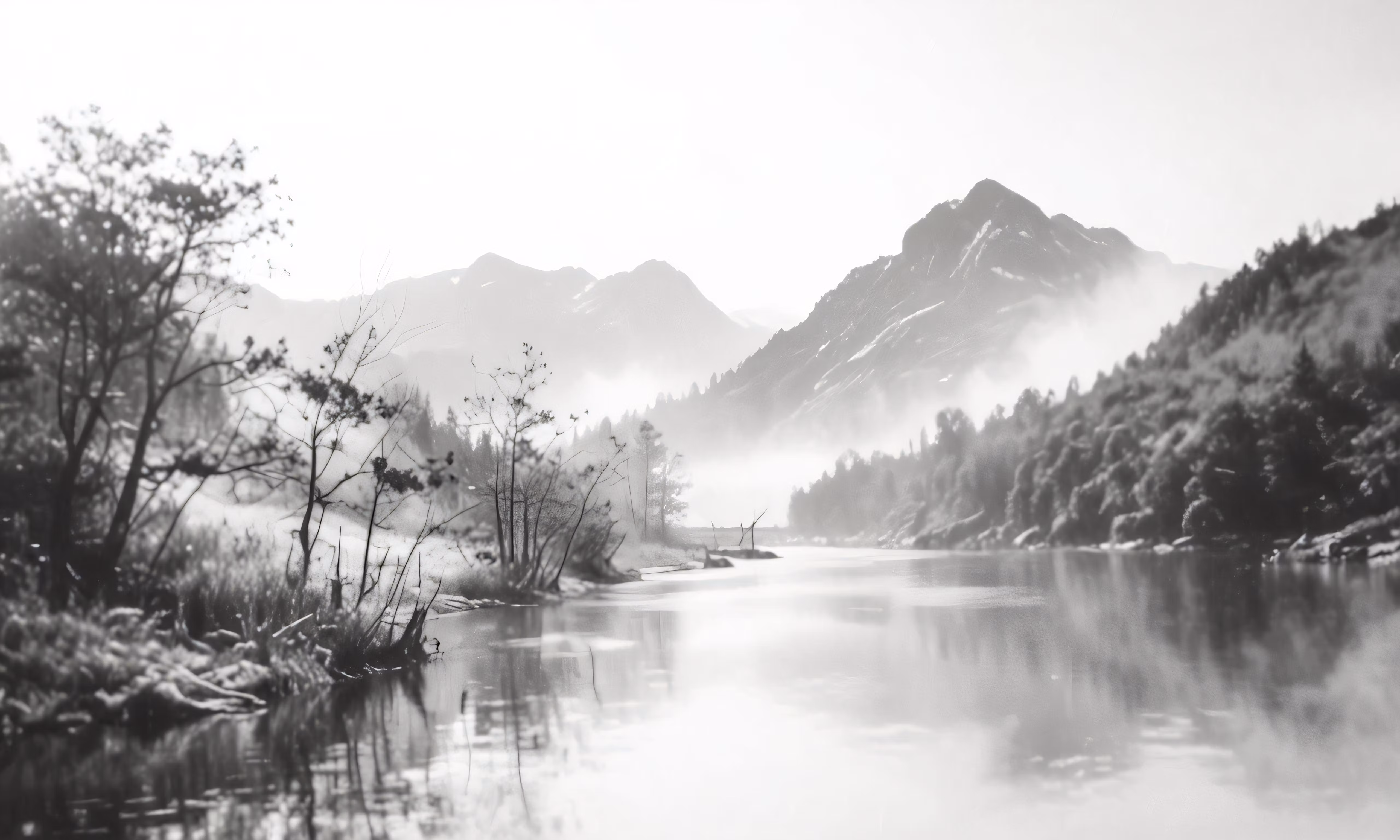 High resolution picture, free to use, a lake surrounded by pine trees and mountains