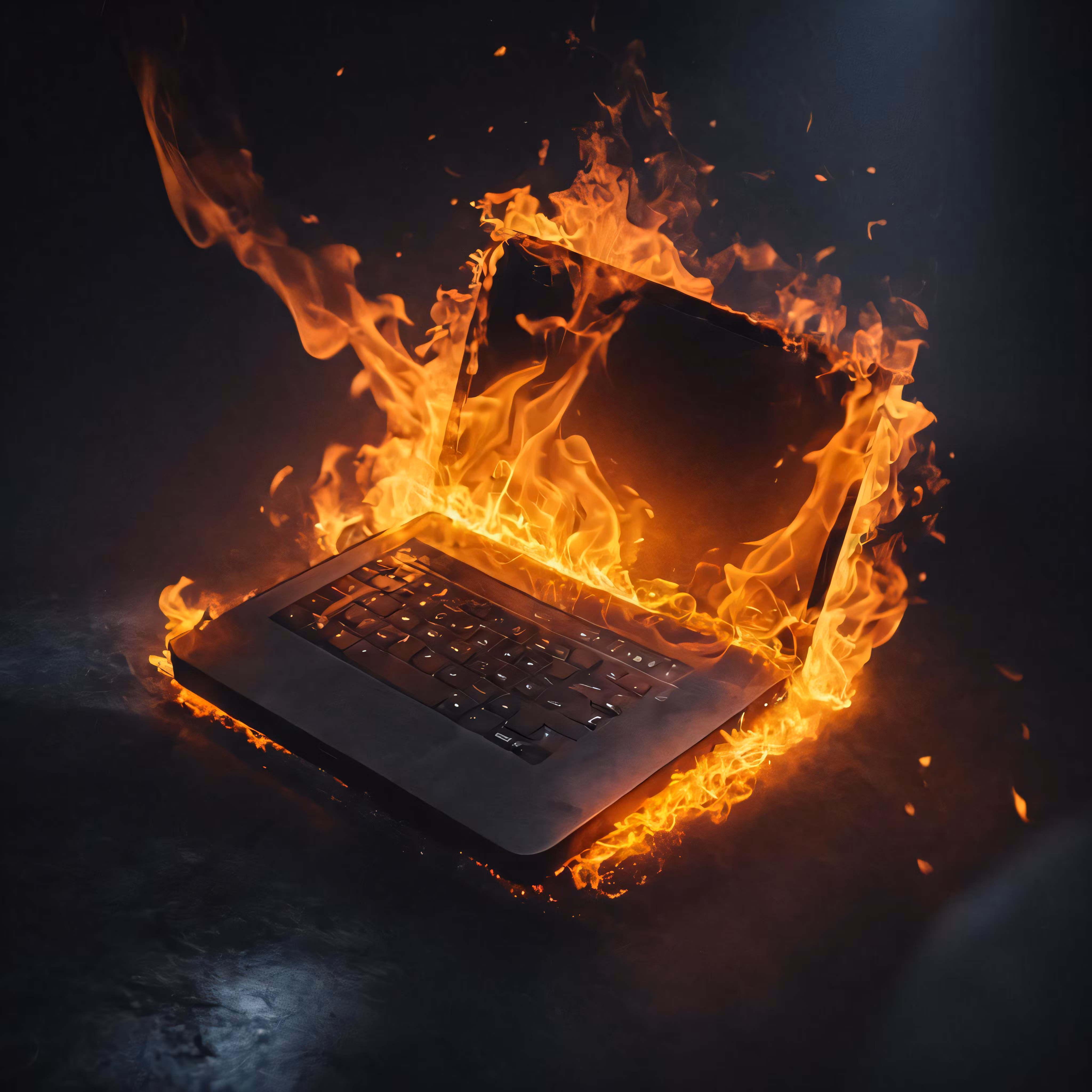 High resolution picture, free to use, a laptop covered in fire sitting on the side of a wall