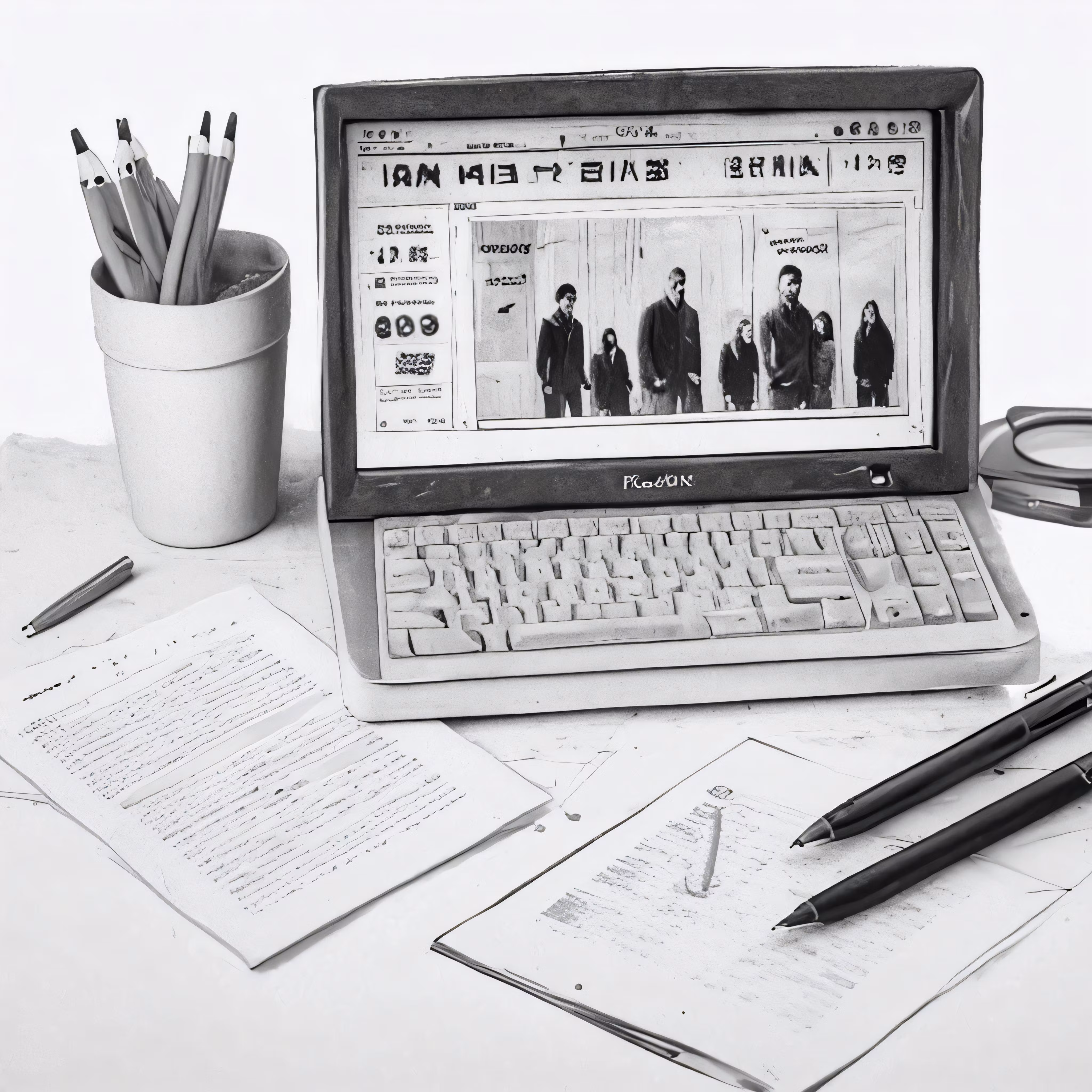 High resolution picture, free to use, a laptop with keyboard and two pens on it