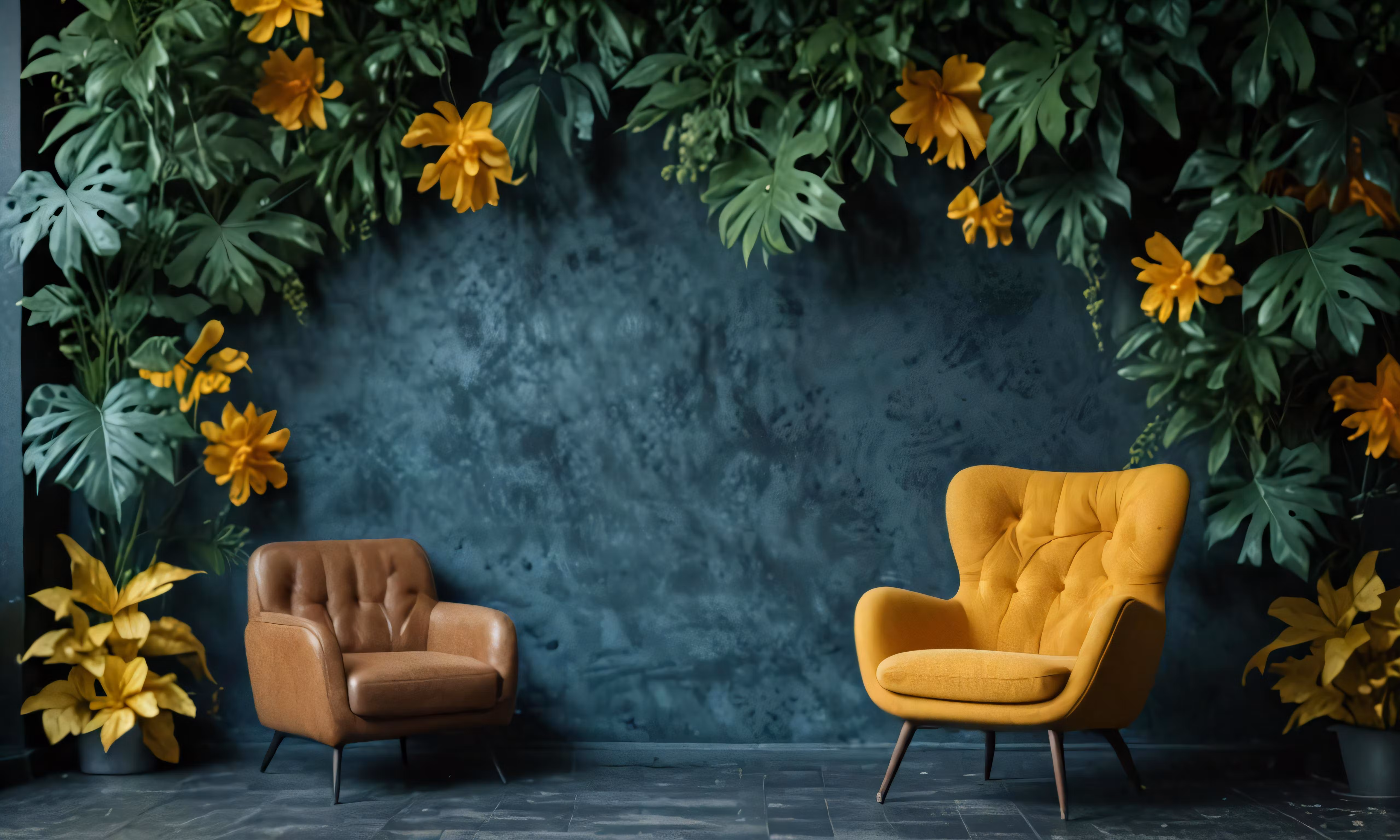 High resolution picture, free to use, a large, green wall with a plant filled pattern and a pair of chairs