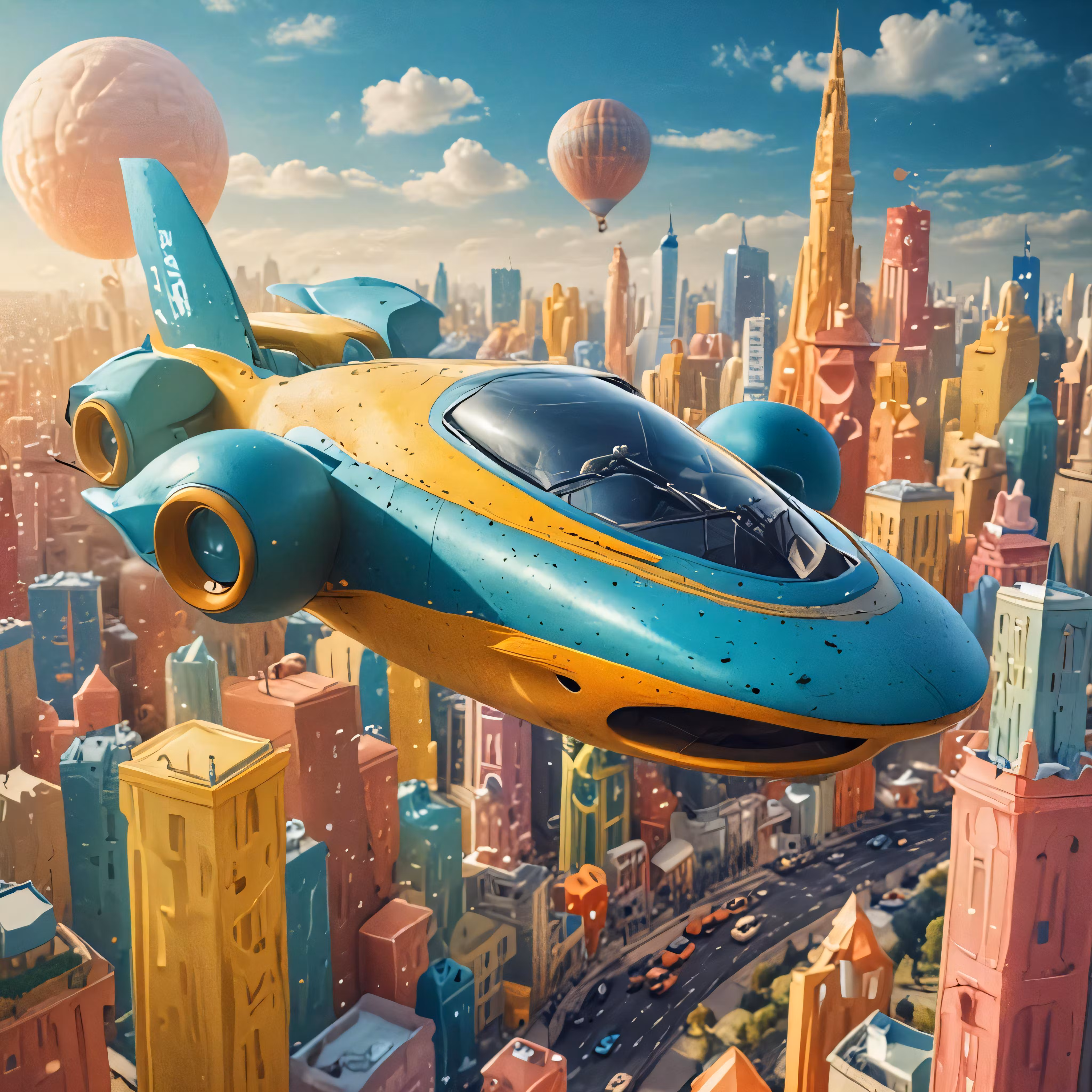 High resolution picture, free to use, a large blue and yellow airplane flying over a city