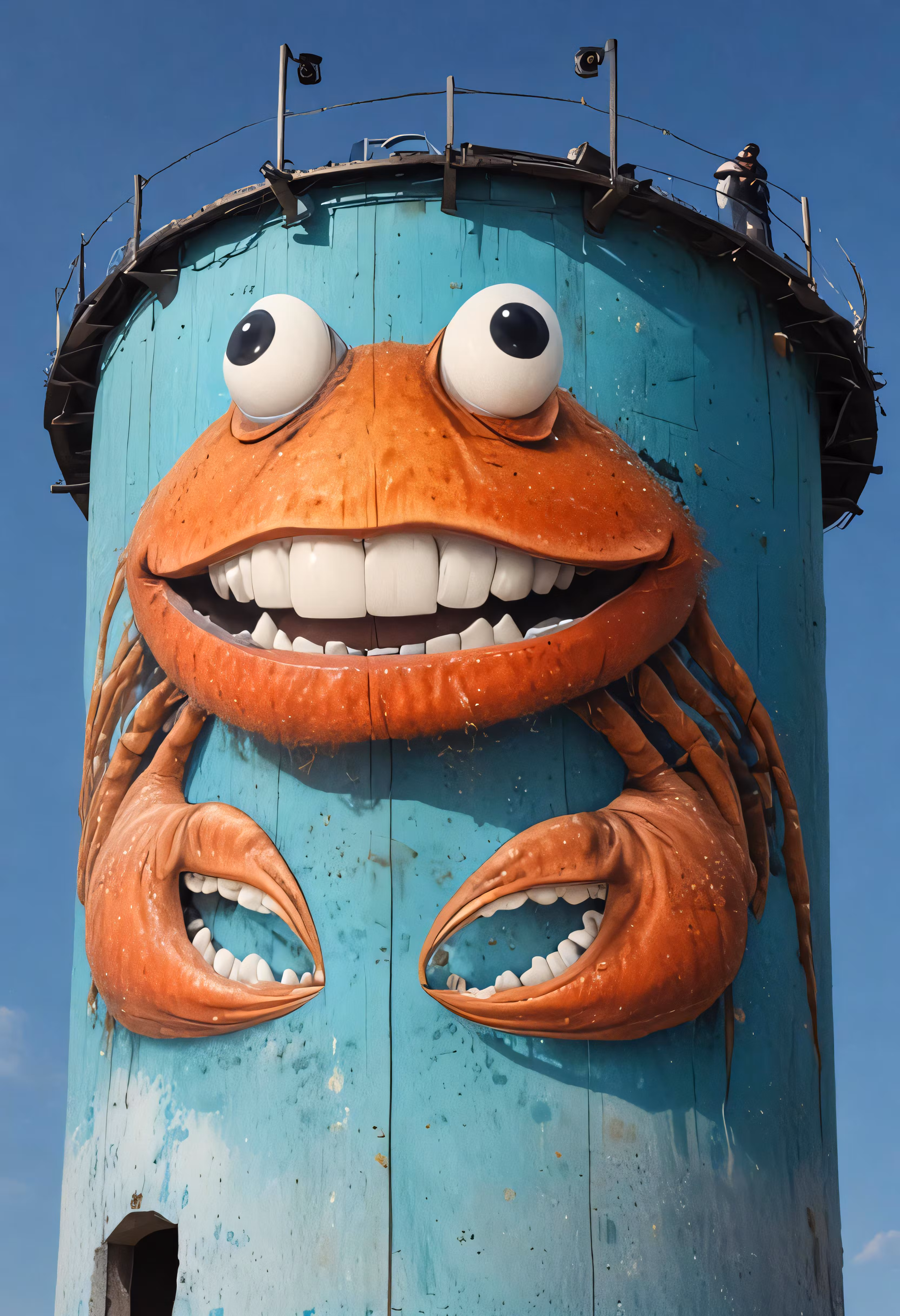 High resolution picture, free to use, a large blue structure with a sign depicting a crab with big eyes
