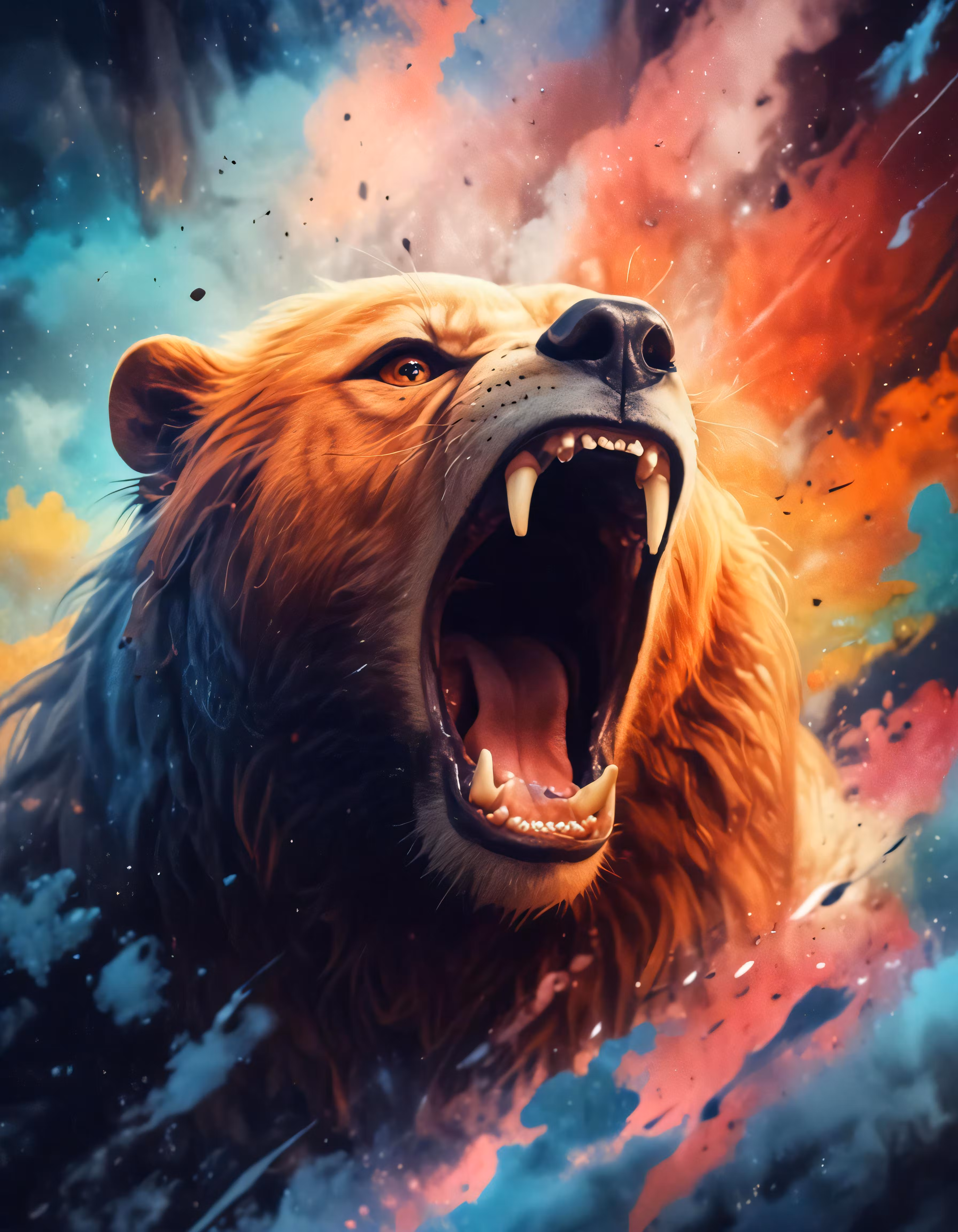 High resolution picture, free to use, a large brown bear with its mouth open, on a cloudy blue background