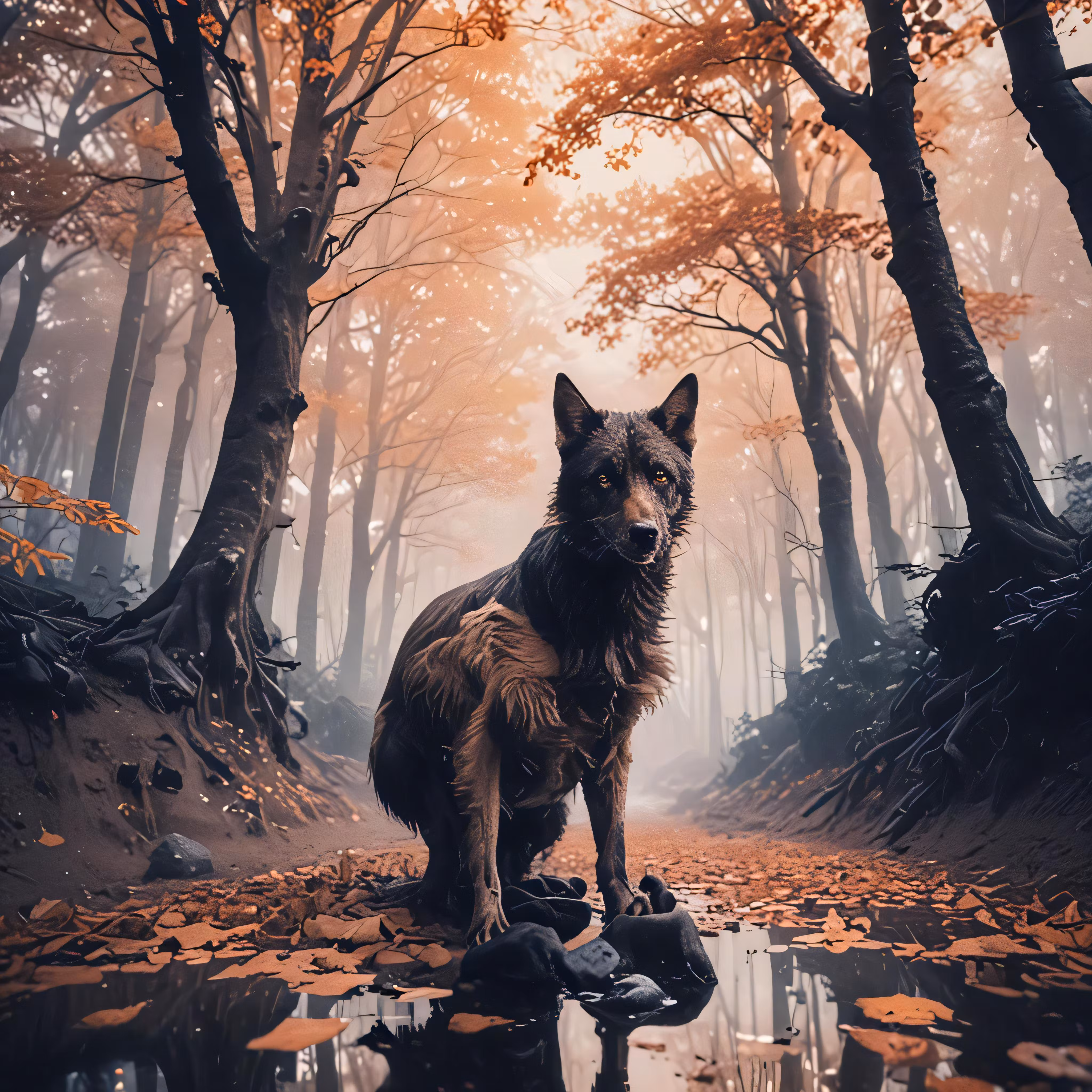 High resolution picture, free to use, a large brown dog sitting on a wet patch of land in front of trees