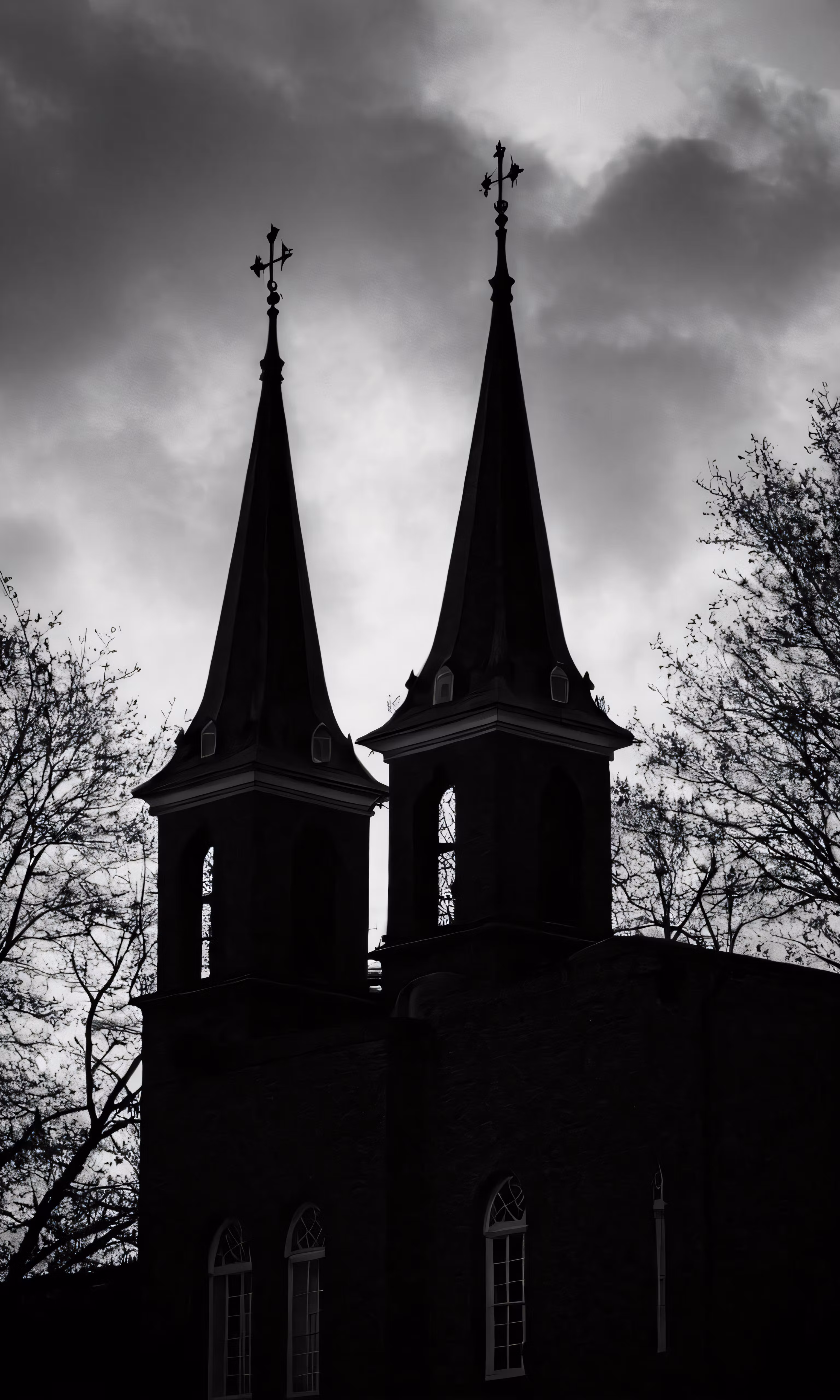 High resolution picture, free to use, a large building with two tall towers under a cloudy sky