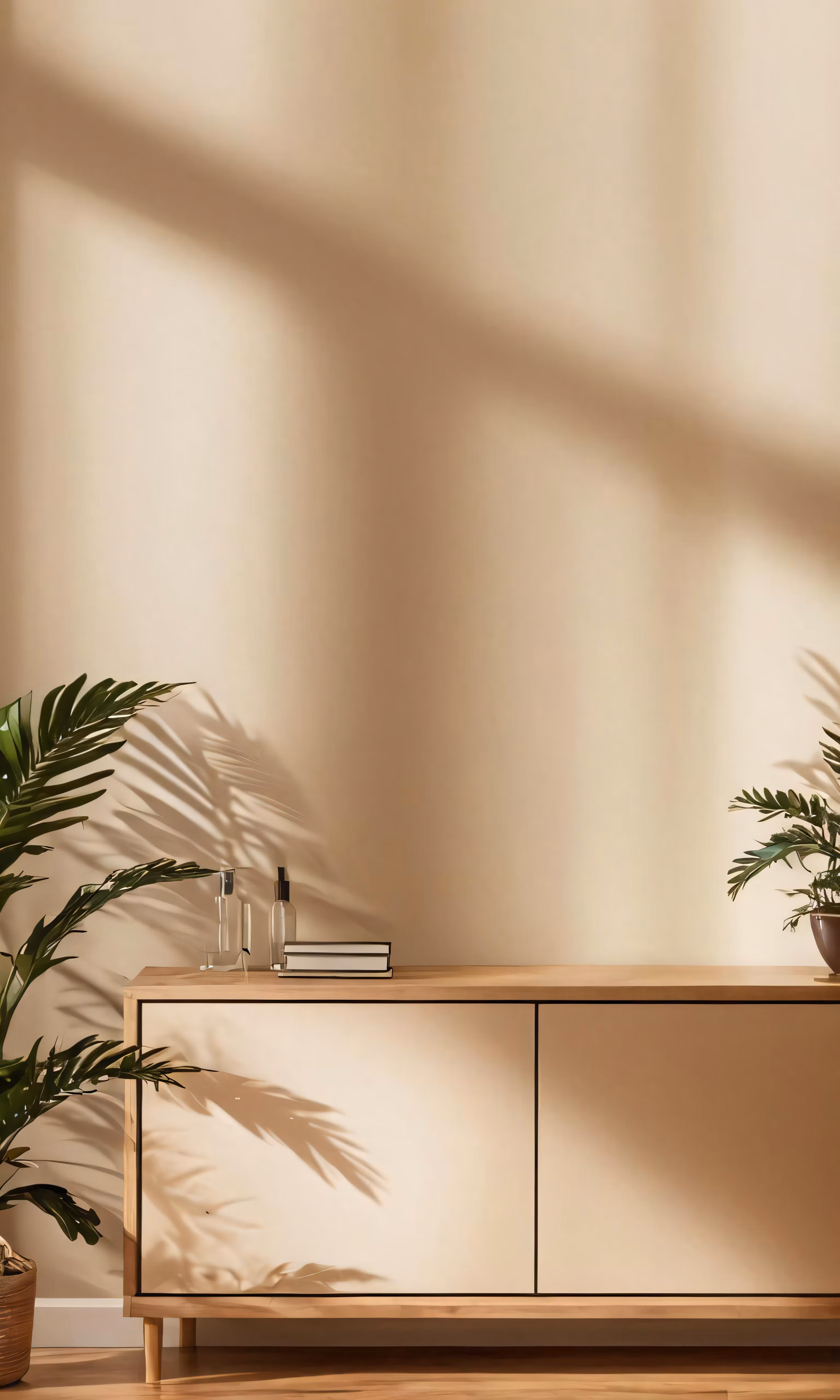High resolution picture, free to use, a large cabinet sits on a wood floor next to two green plants