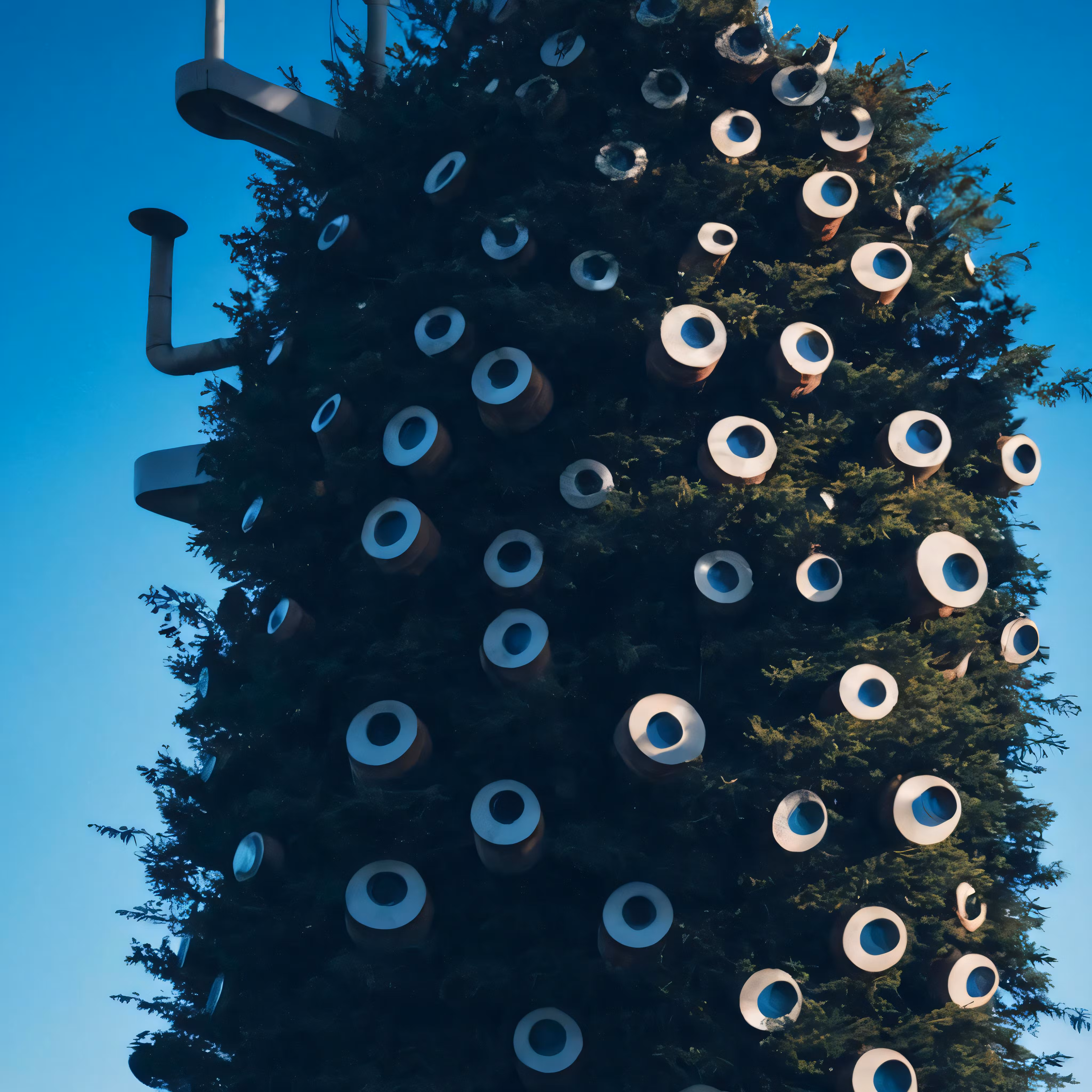 High resolution picture, free to use, a large christmas tree has several metal pieces on it