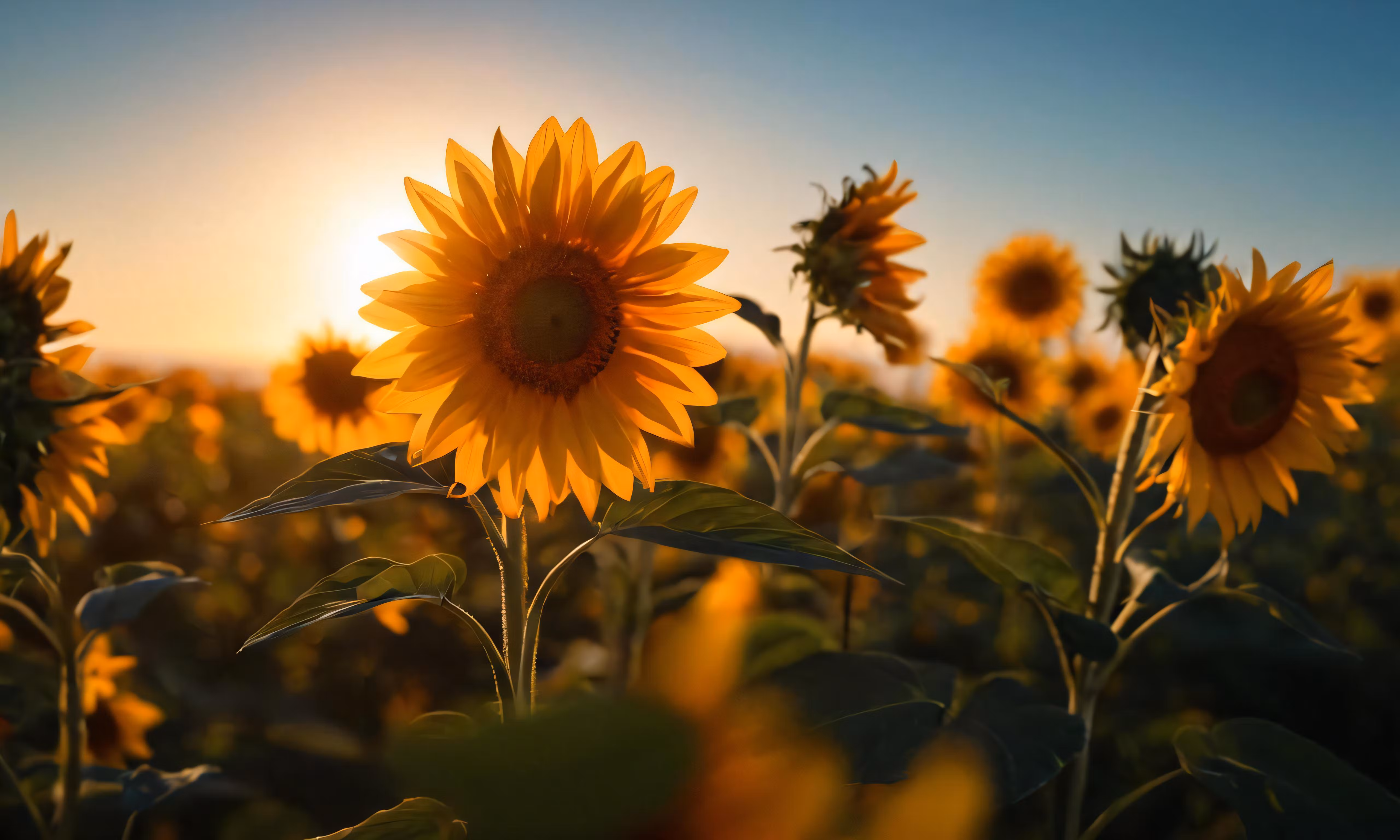 High resolution picture, free to use, a large field of sunflowers are in the middle of a sun setting