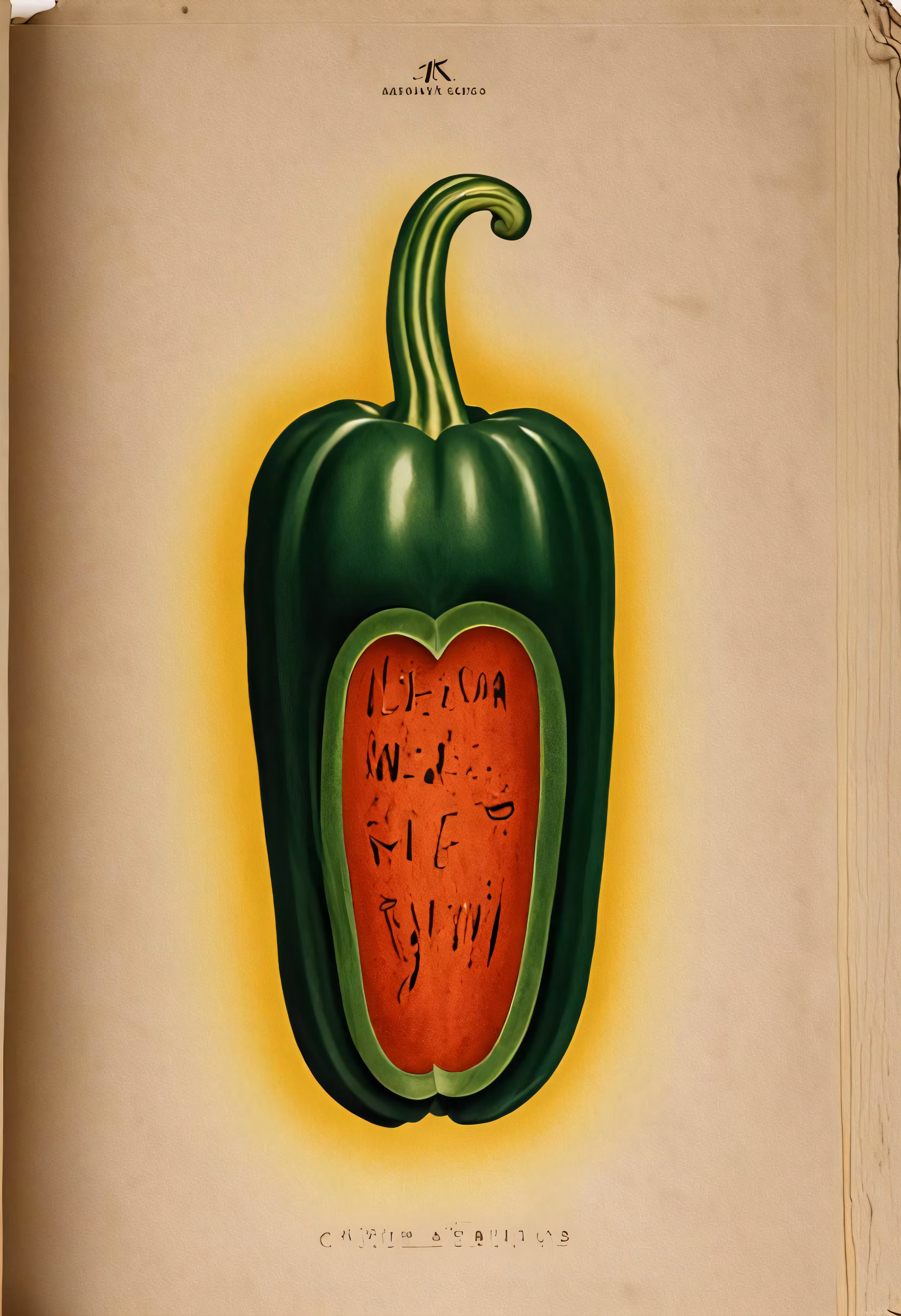 High resolution picture, free to use, a large green and orange pepper on top of a book