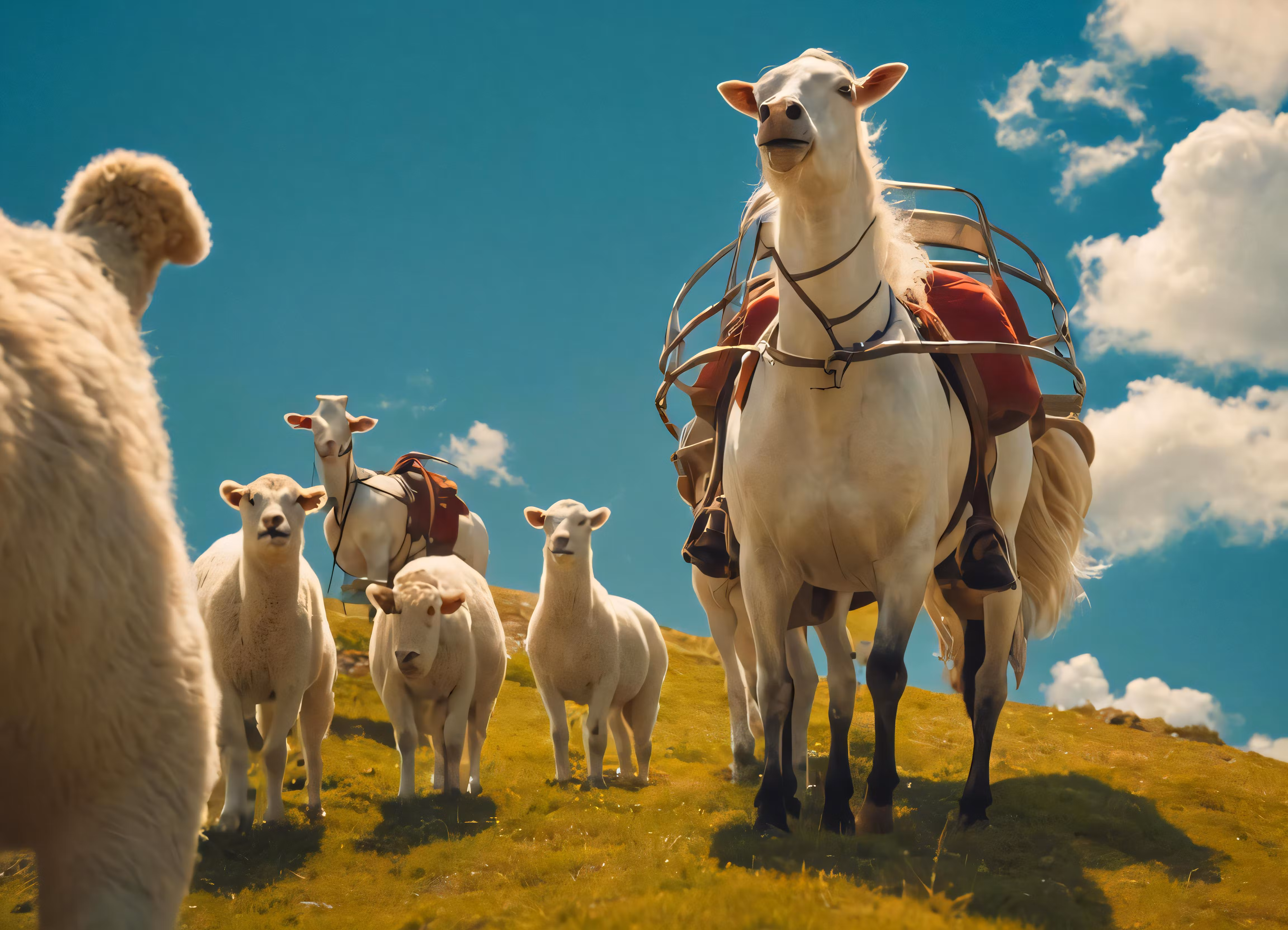 High resolution picture, free to use, a large horse drawn carriage next to a herd of sheep