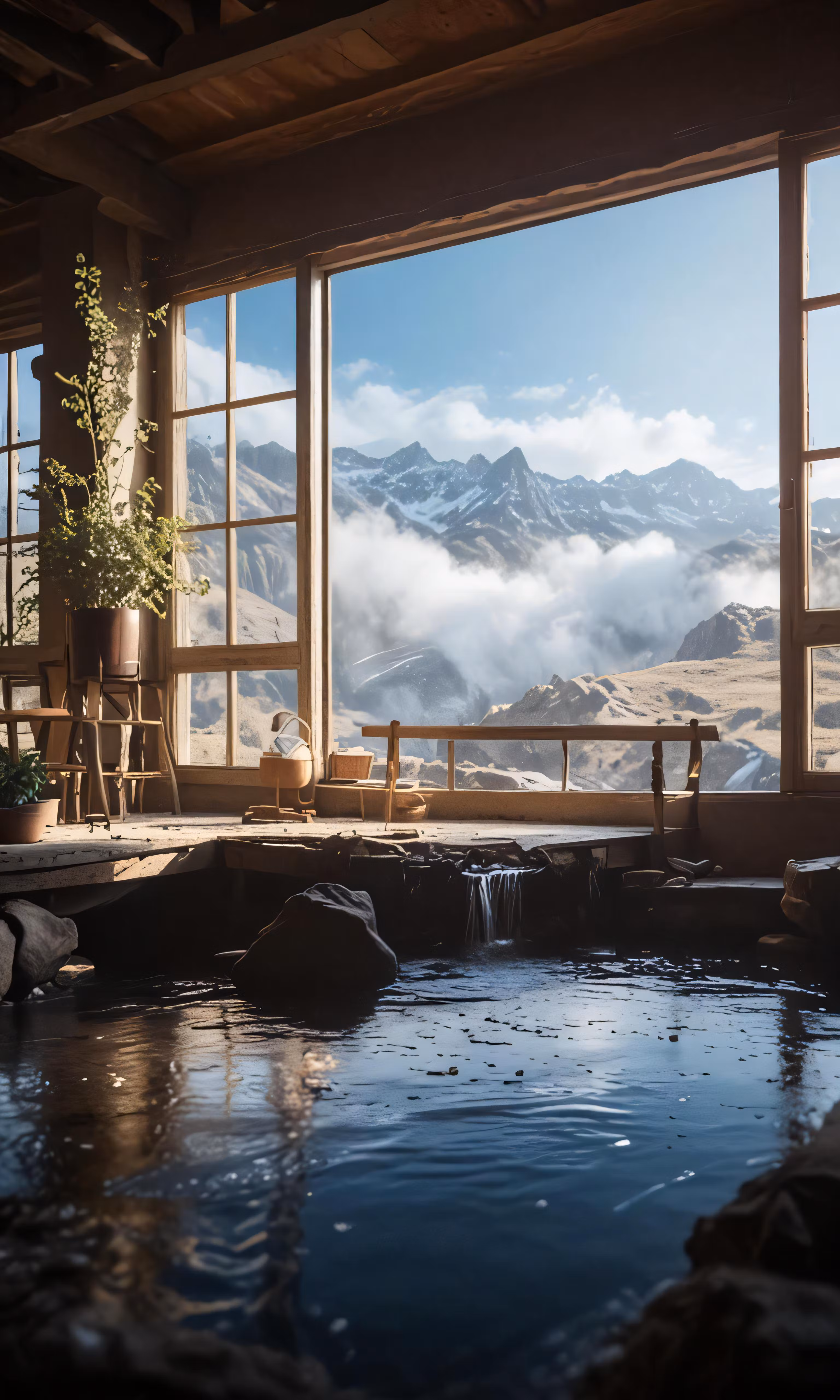 High resolution picture, free to use, a large hot tub sitting next to a window on a wooden platform