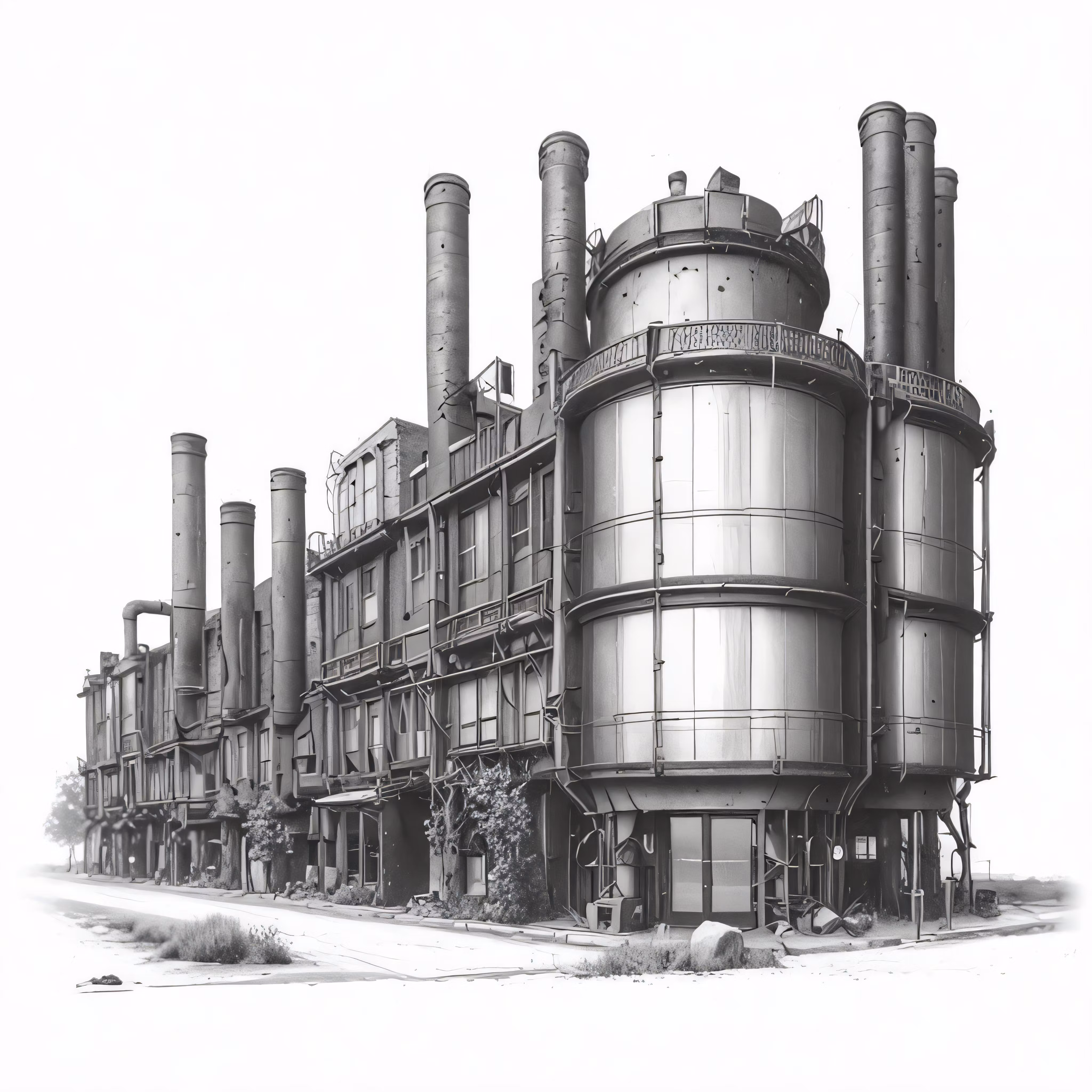 High resolution picture, free to use, a large industrial building sitting in front of a tree