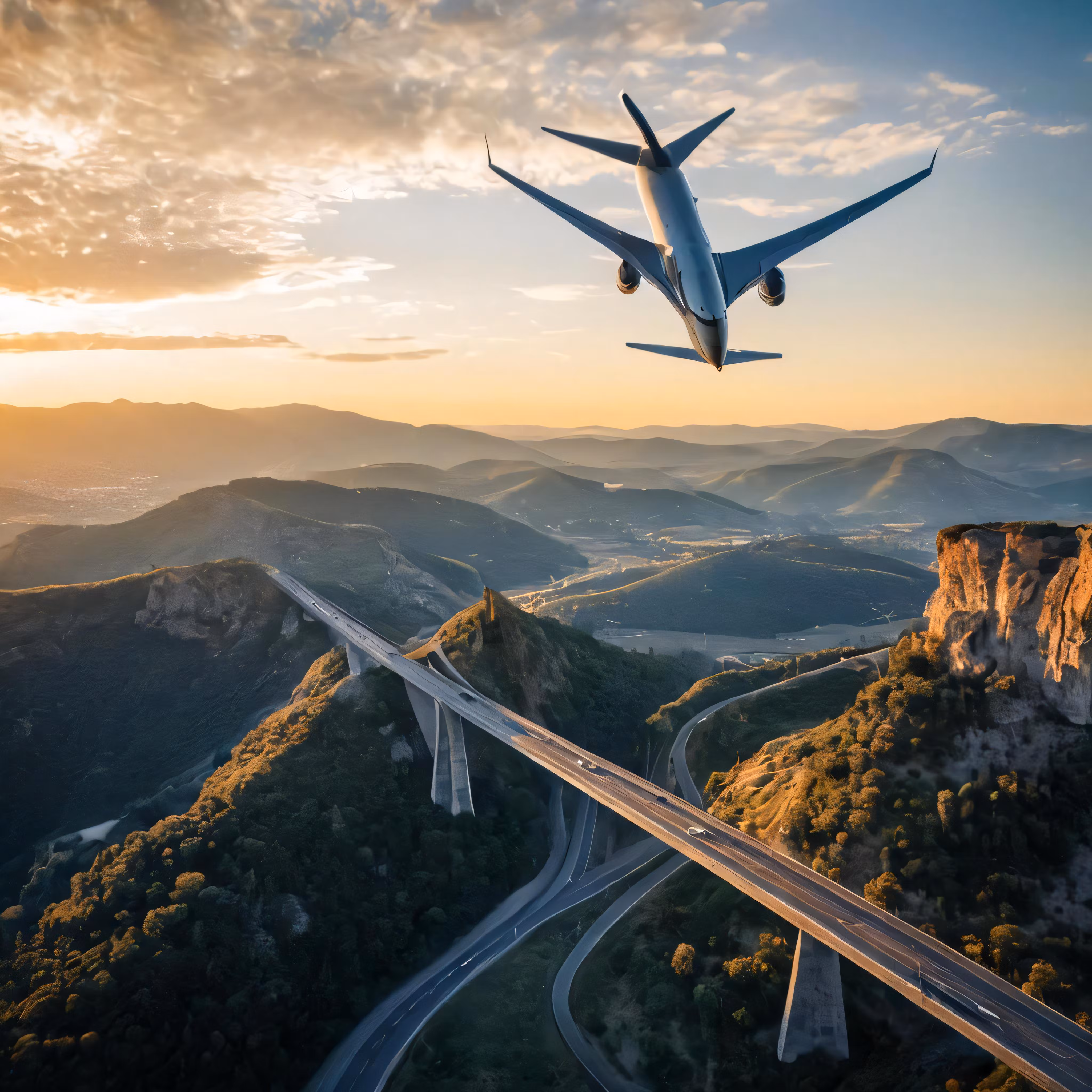 High resolution picture, free to use, a large jetliner flying over a lush green hillside