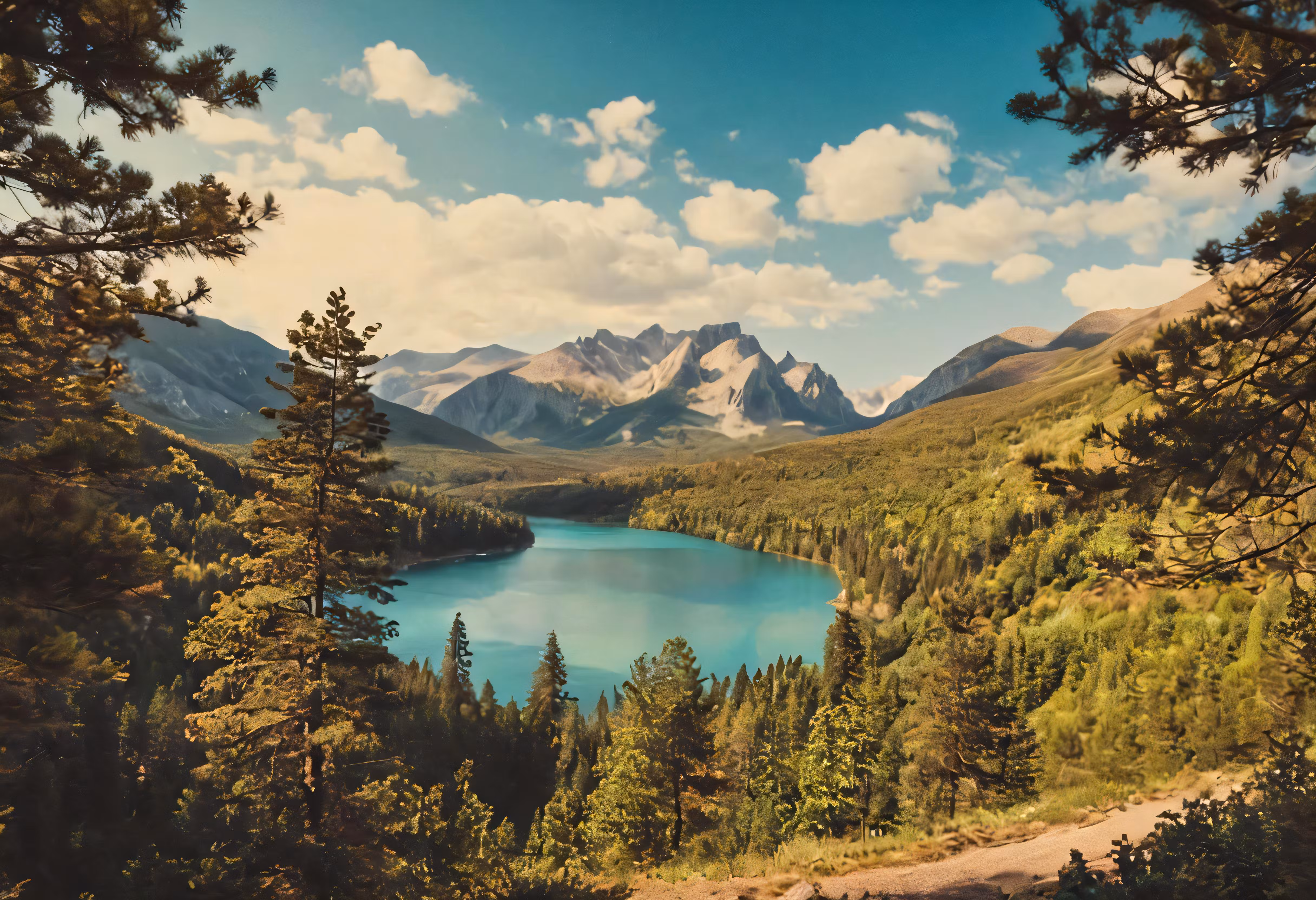High resolution picture, free to use, a large lake is surrounded by some tall pine trees