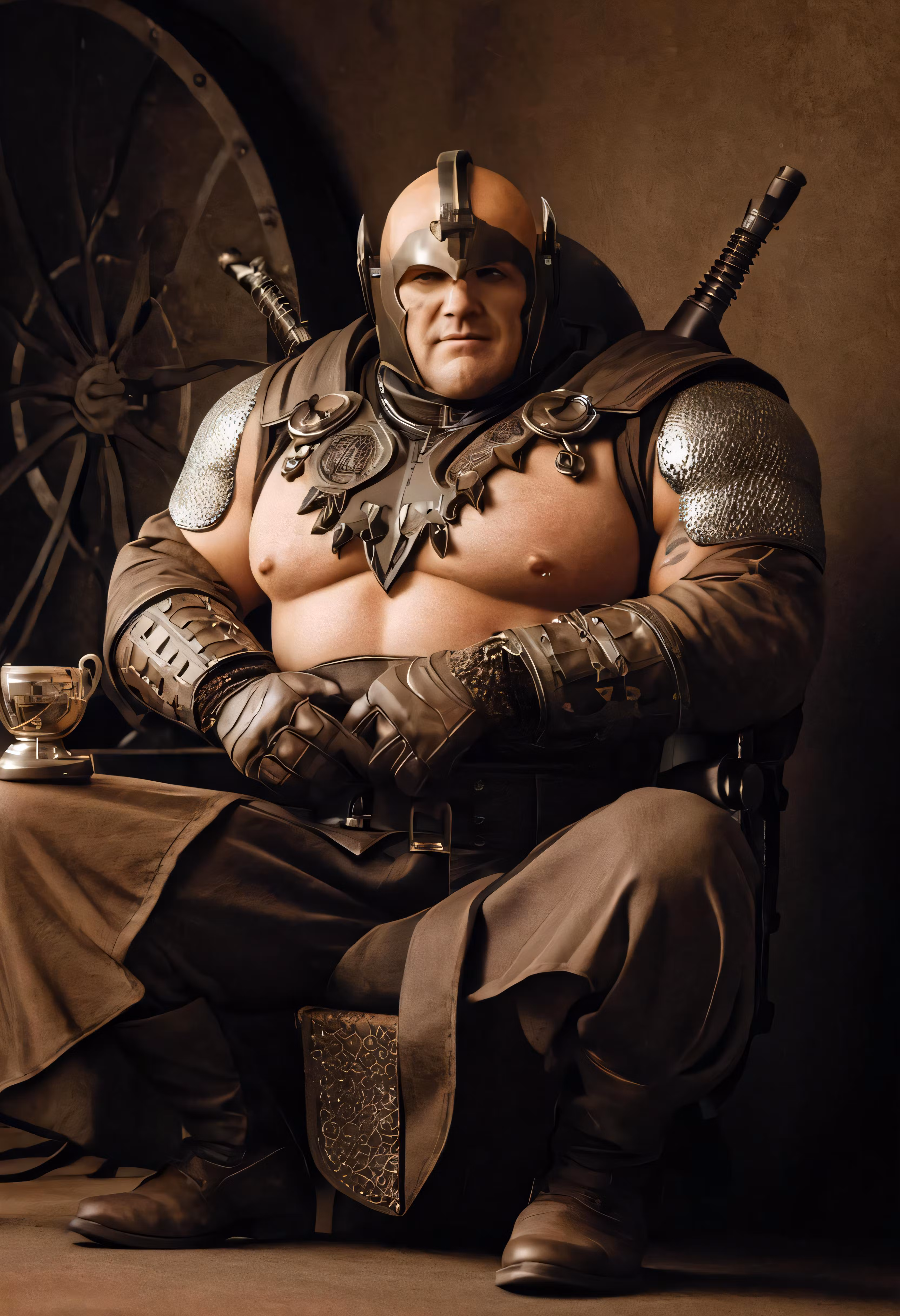 High resolution picture, free to use, a large man in armor sits with a sword and a drink