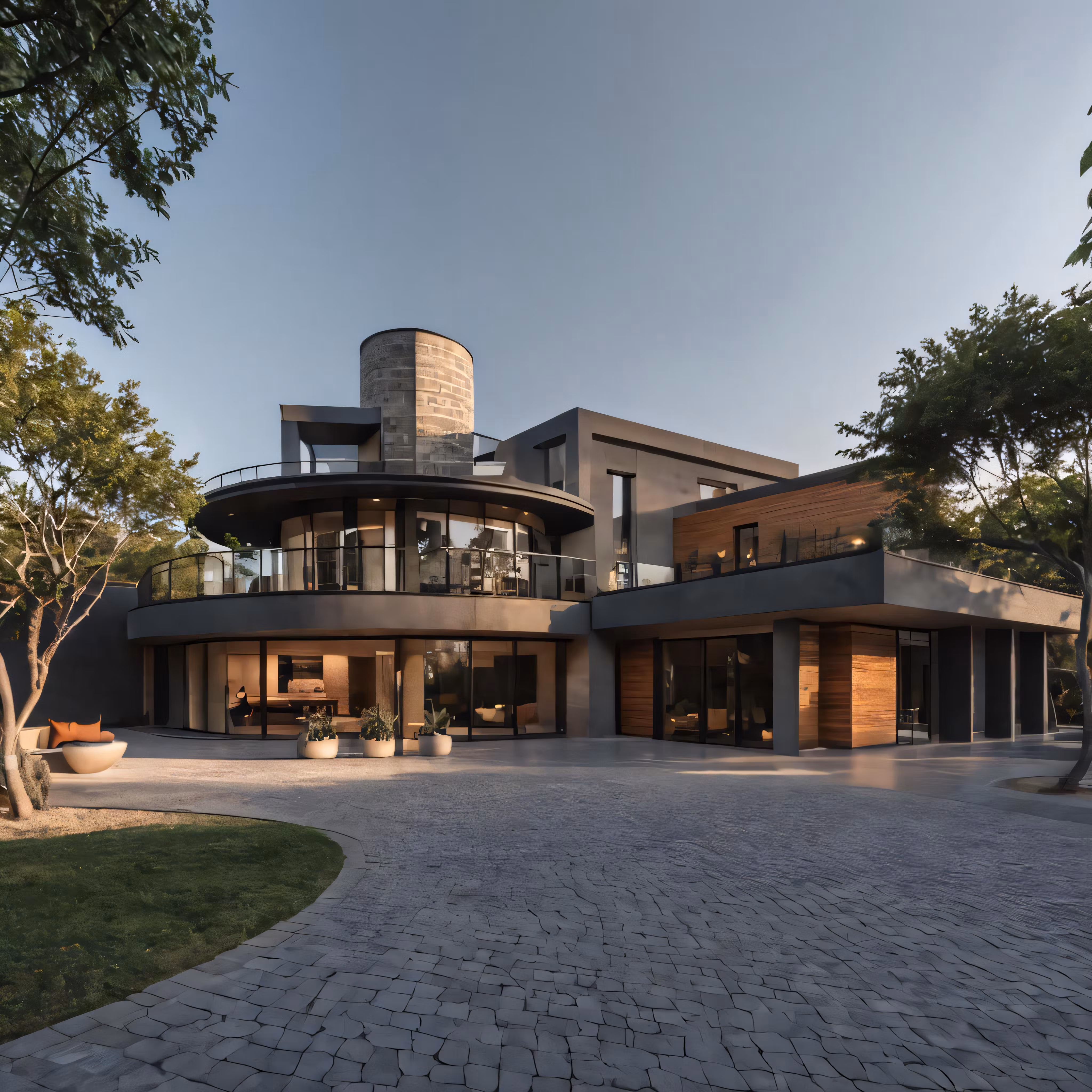 High resolution picture, free to use, a large modern home is in the background with lots of trees and shrubs around it