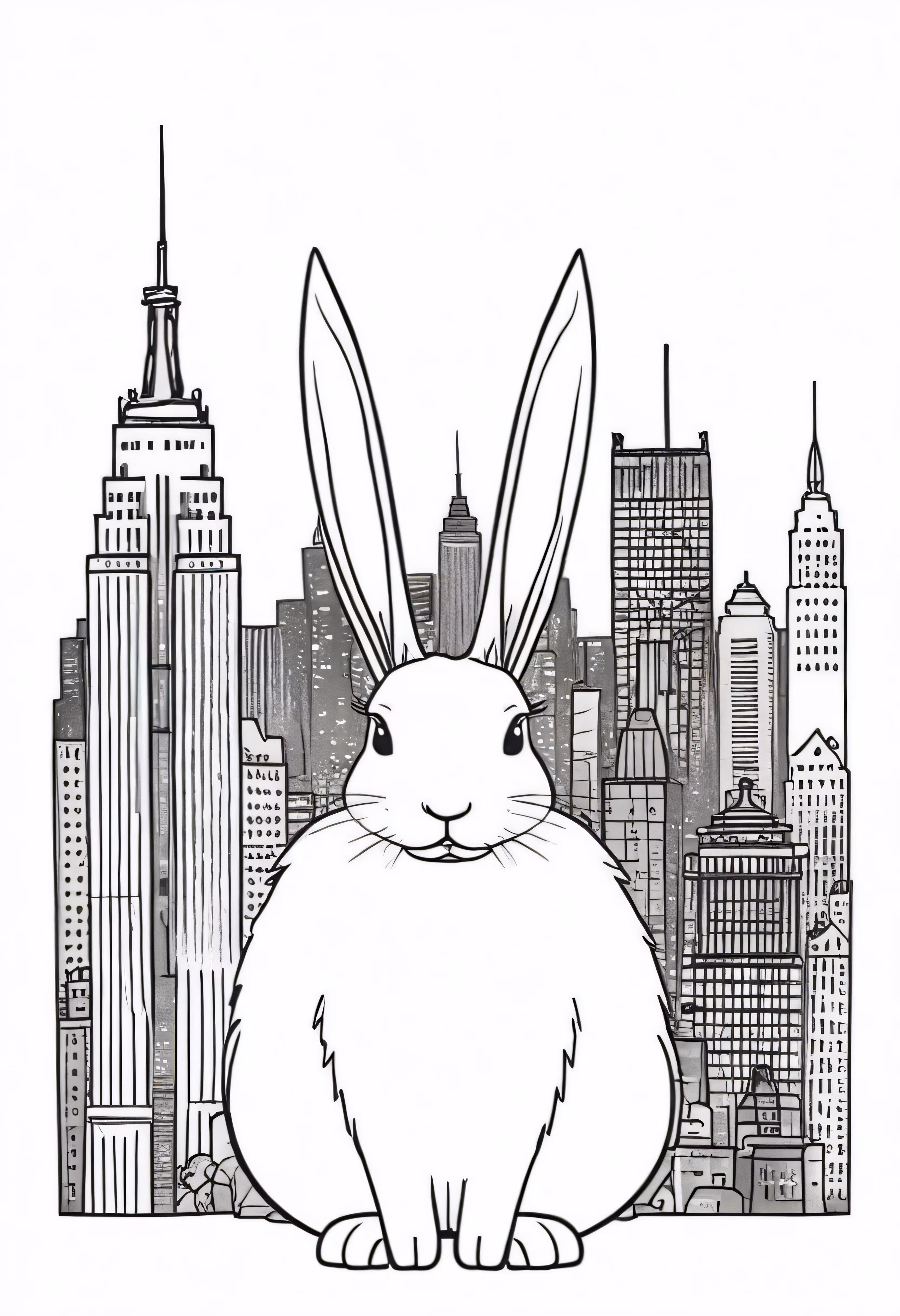 High resolution picture, free to use, a large rabbit sits in front of a big city
