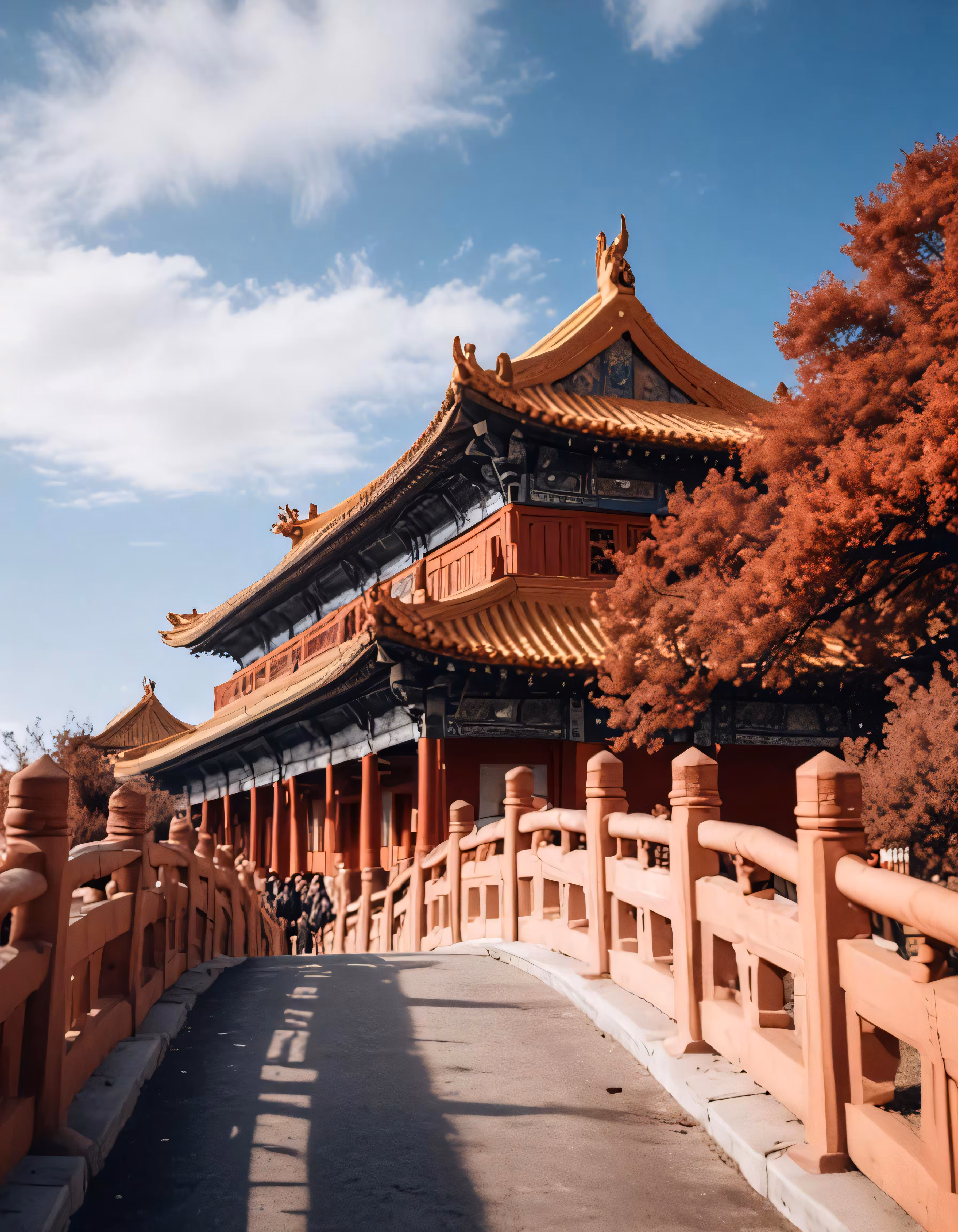 High resolution picture, free to use, a large red building with some trees in front of it
