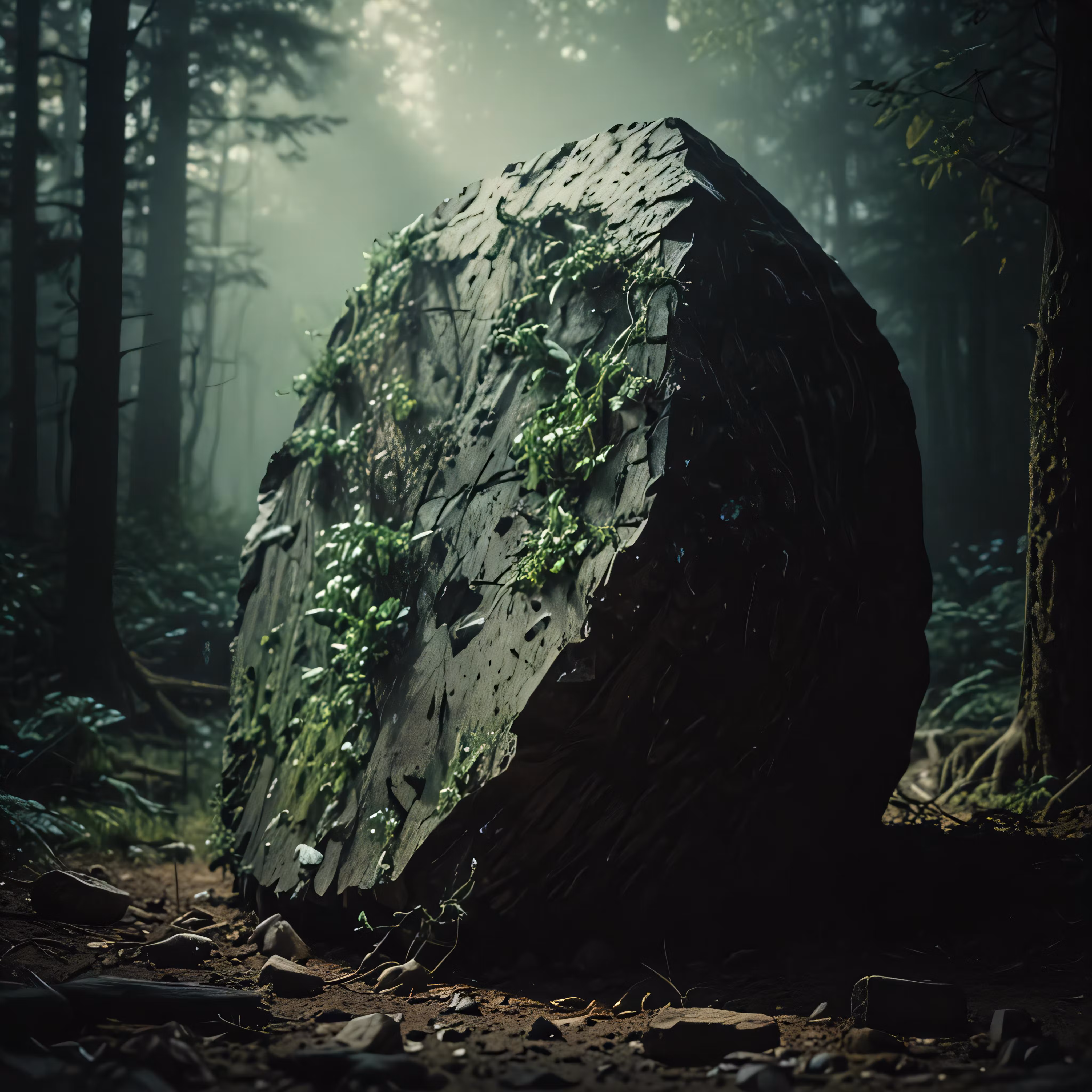 High resolution picture, free to use, a large rock covered in ivy growing on the woods