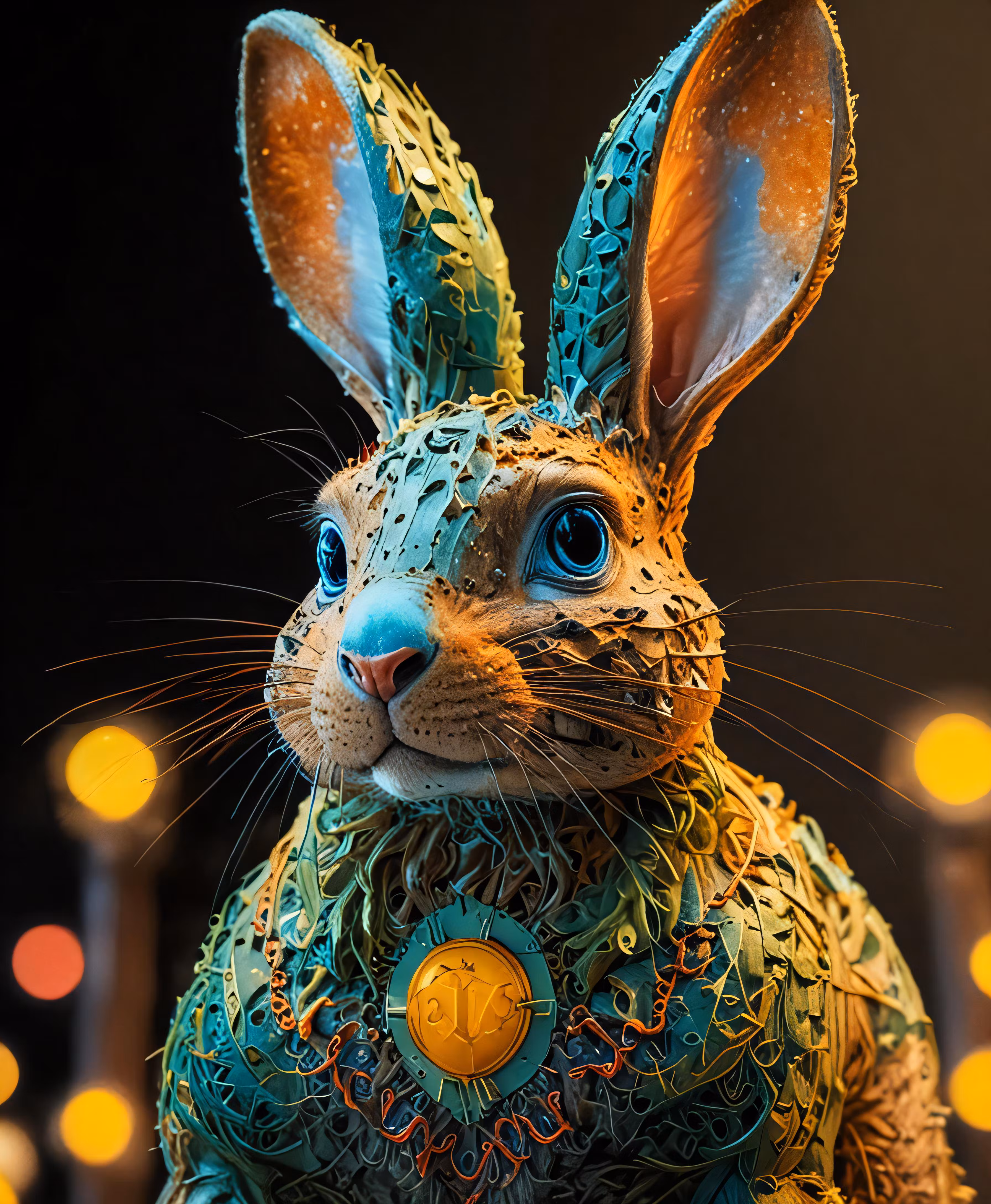 High resolution picture, free to use, a large statue of a rabbit with bright lights in the background
