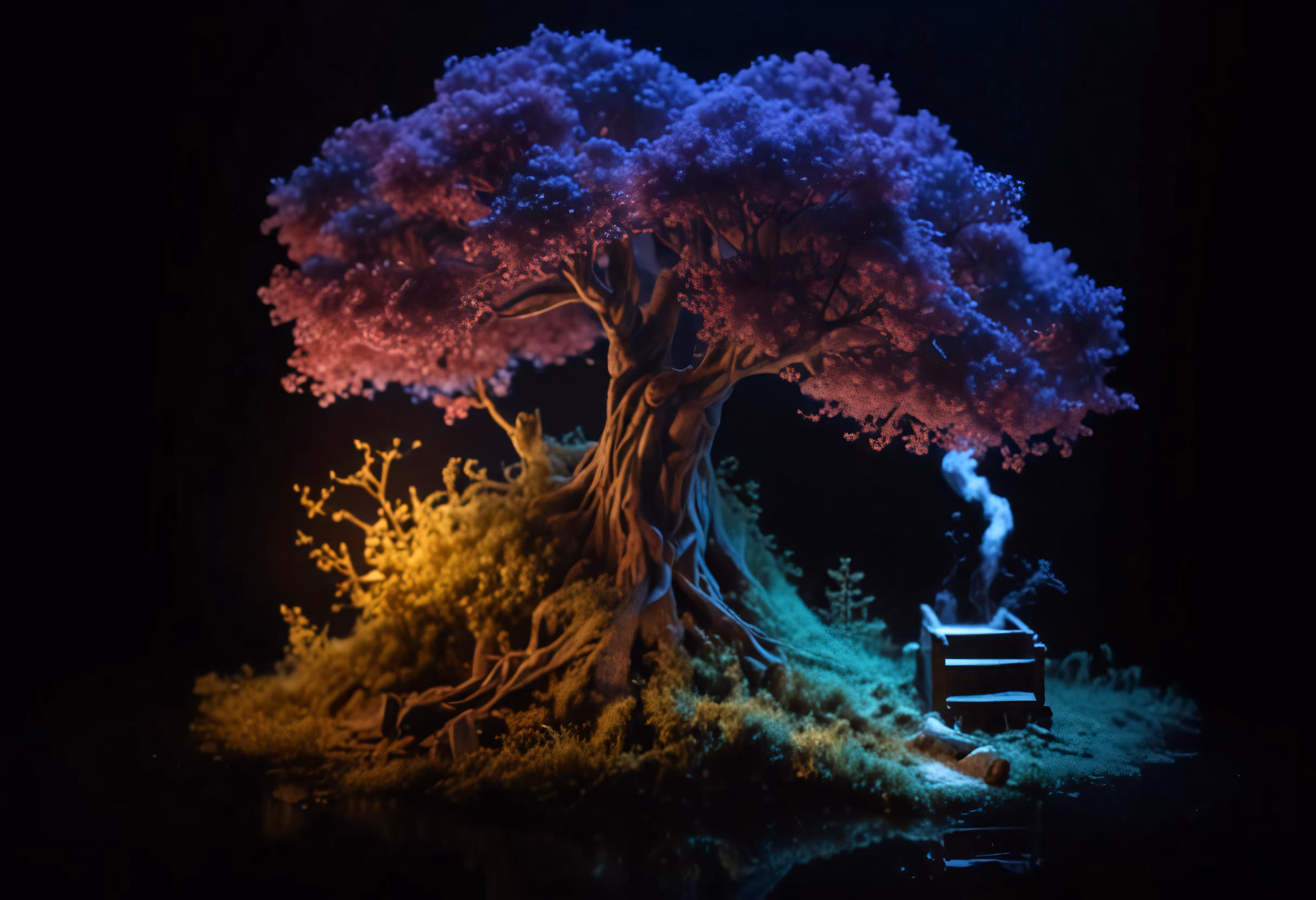 High resolution picture, free to use, a large tree sitting next to a bench under a purple light