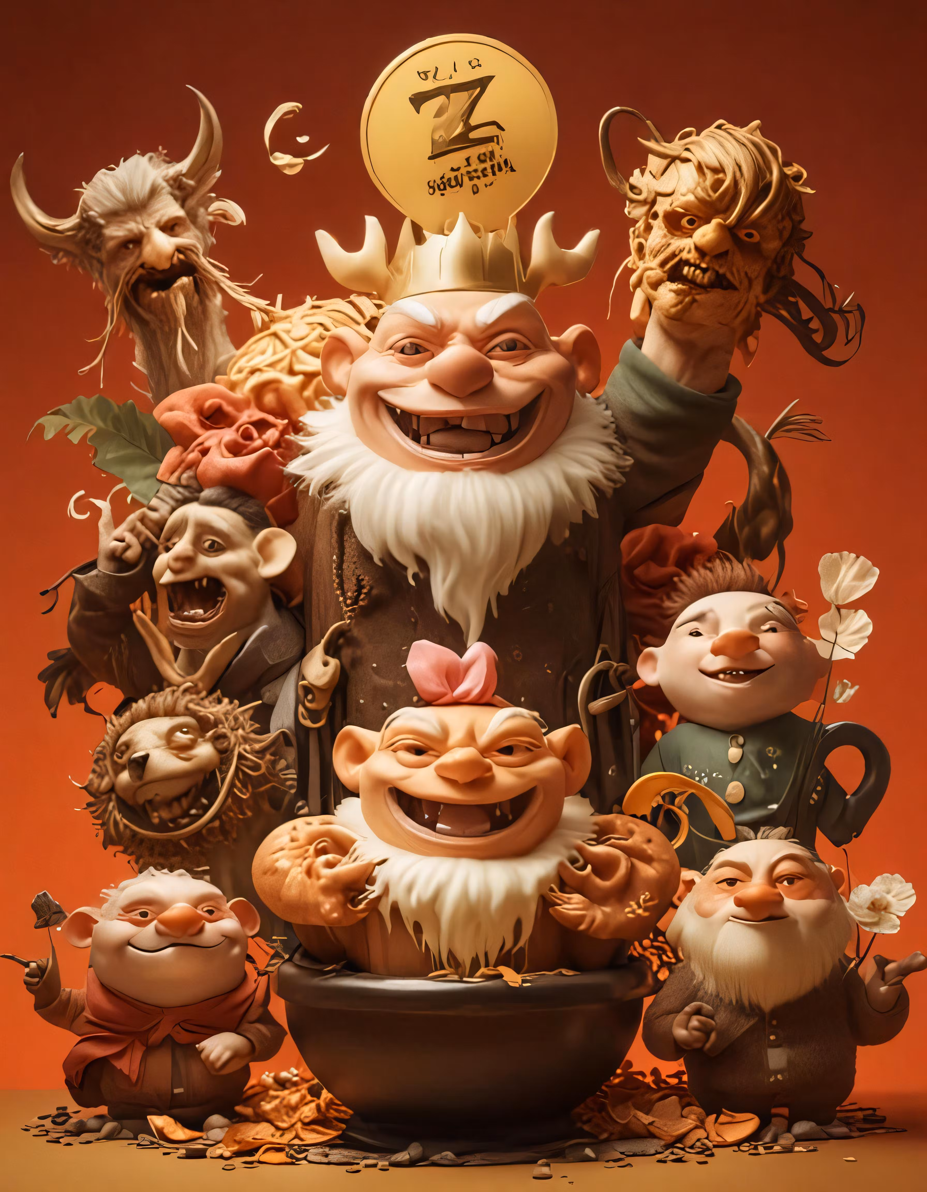 High resolution picture, free to use, a large troll statue surrounded by many different characters