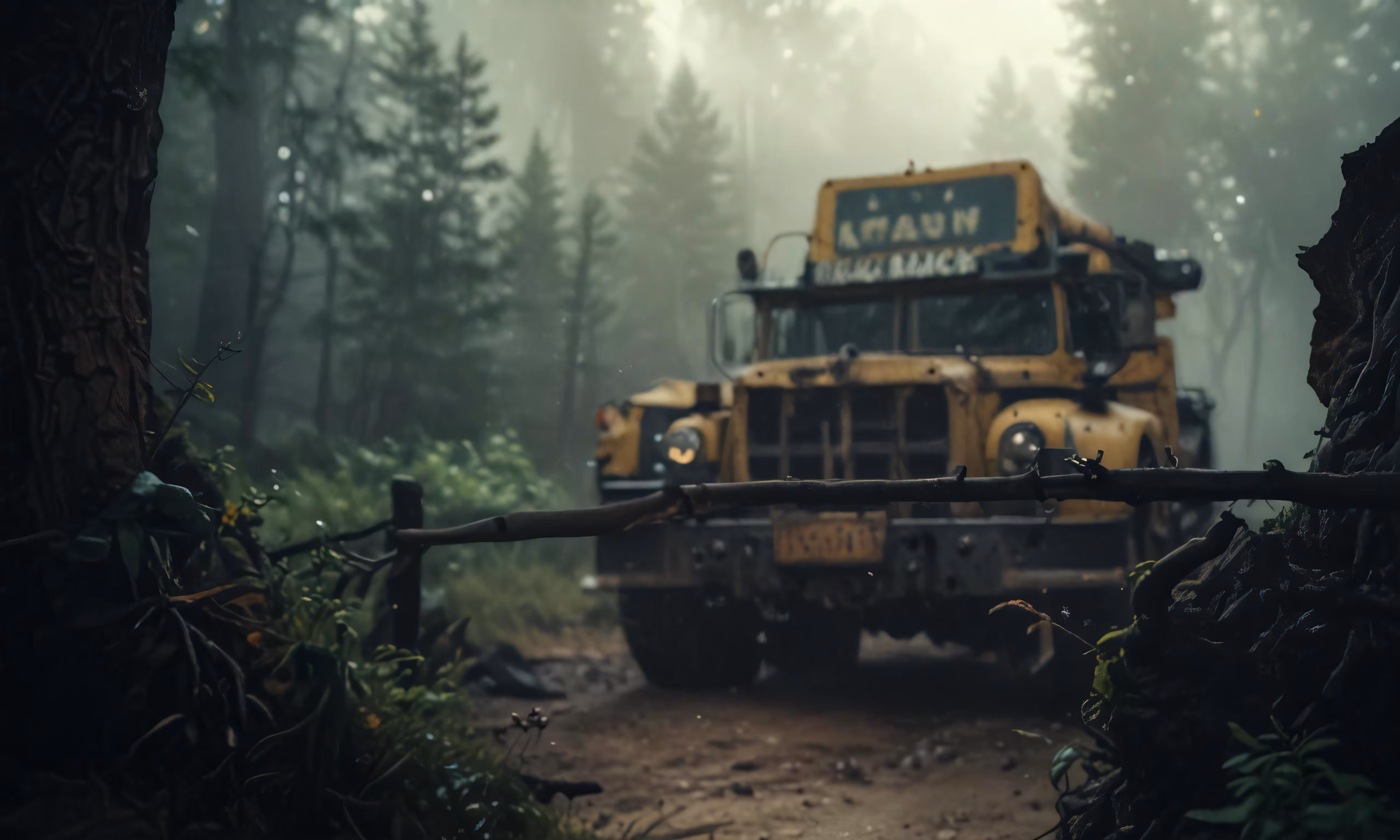 High resolution picture, free to use, a large truck traveling through a forest on a road