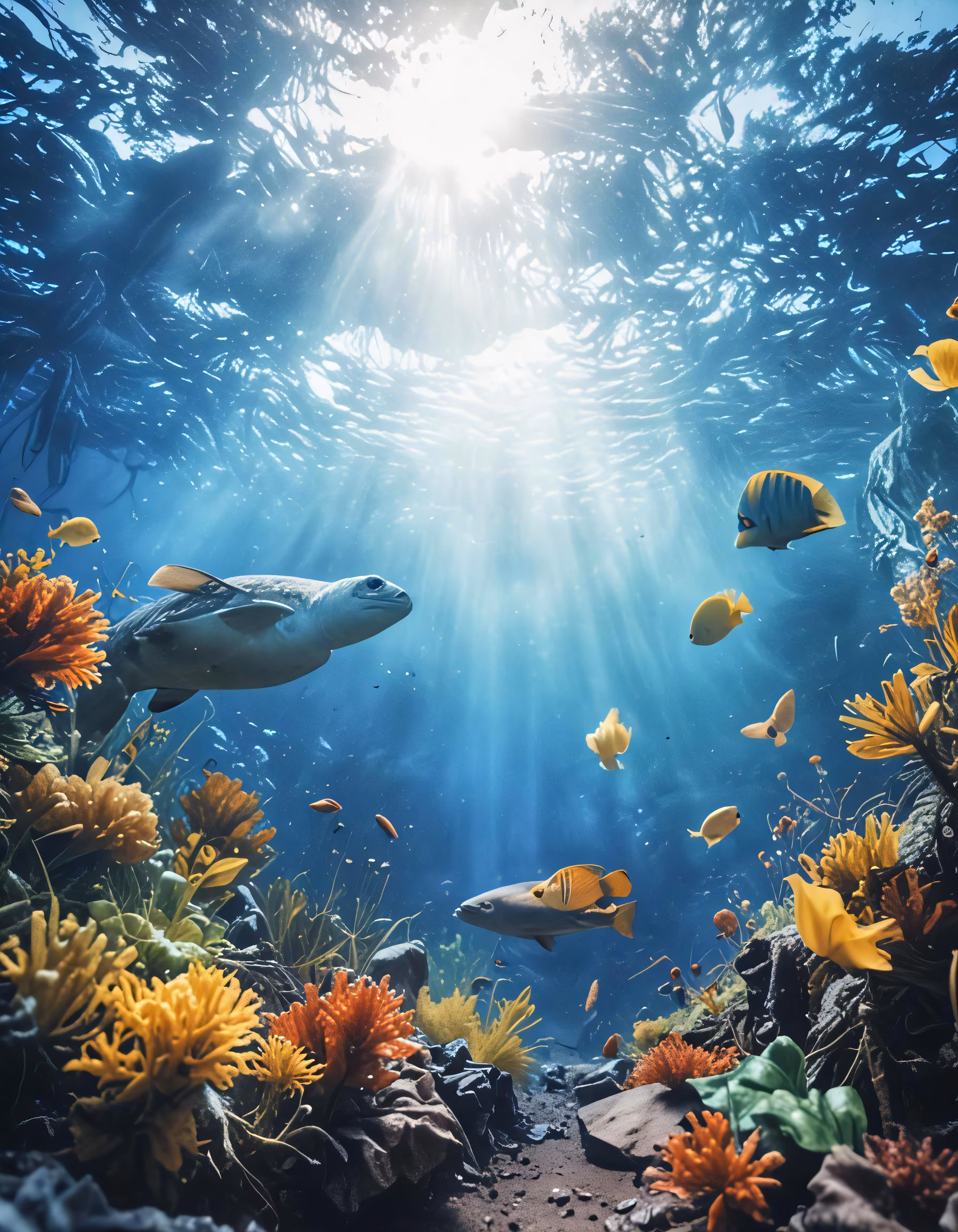 High resolution picture, free to use, a large underwater with different types of animals