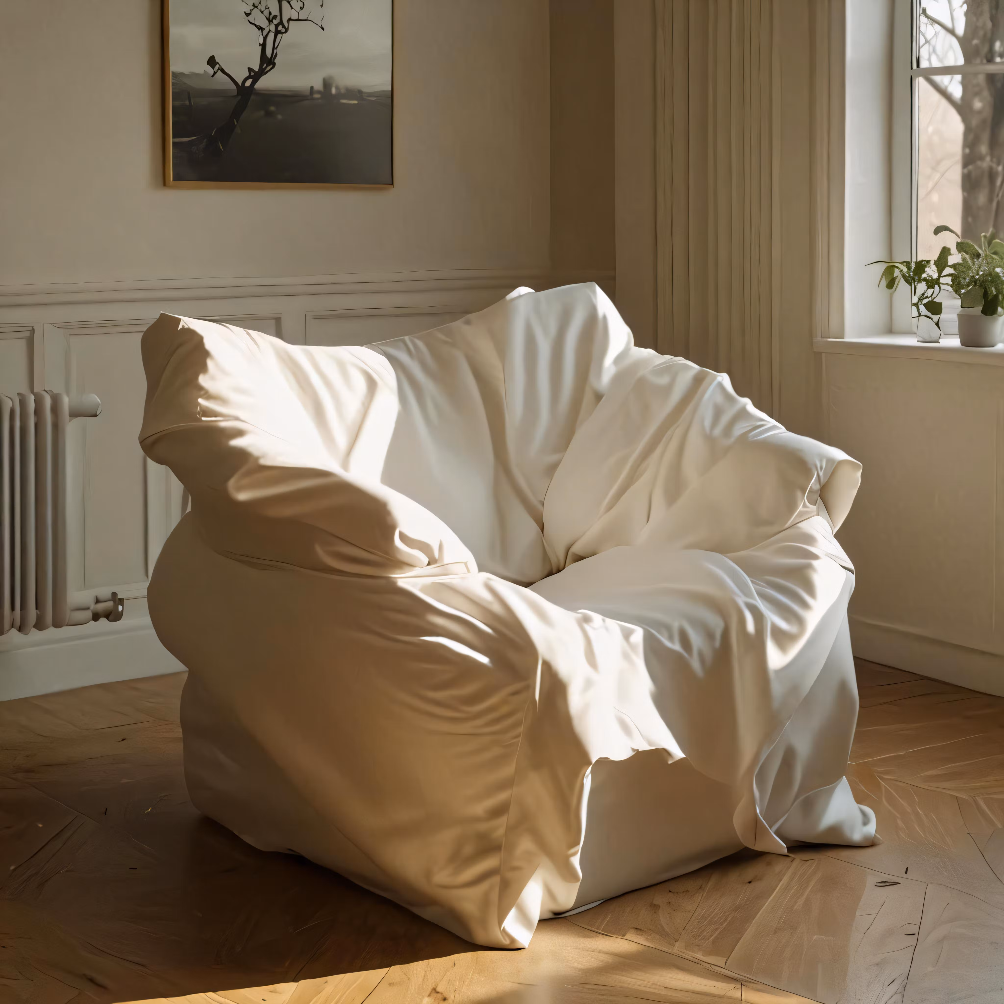 High resolution picture, free to use, a large white bean bag chair that is partially covered