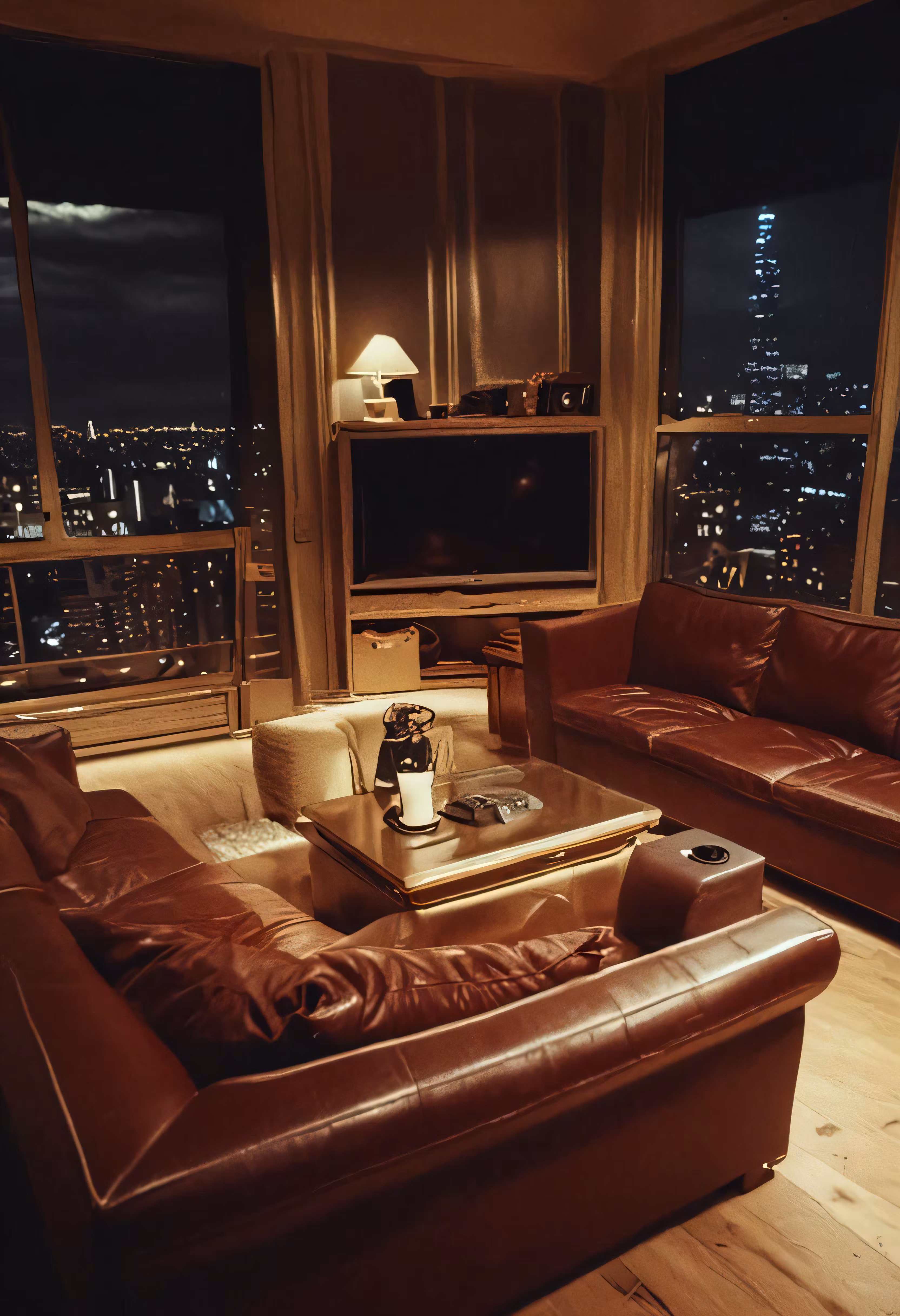 High resolution picture, free to use, a leather couch and two brown chairs in a room with big windows