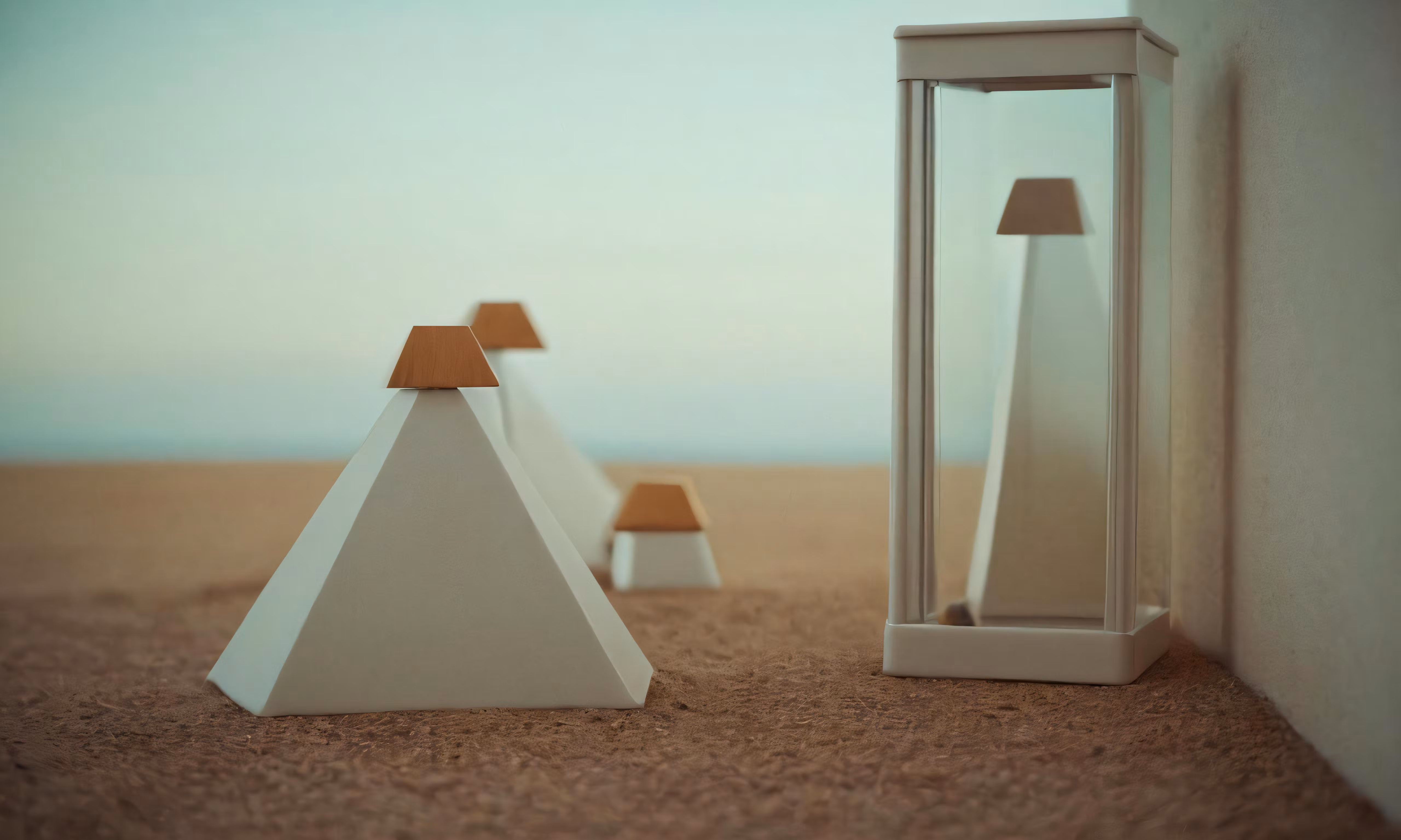 High resolution picture, free to use, a light fixture sitting between two white pyramids