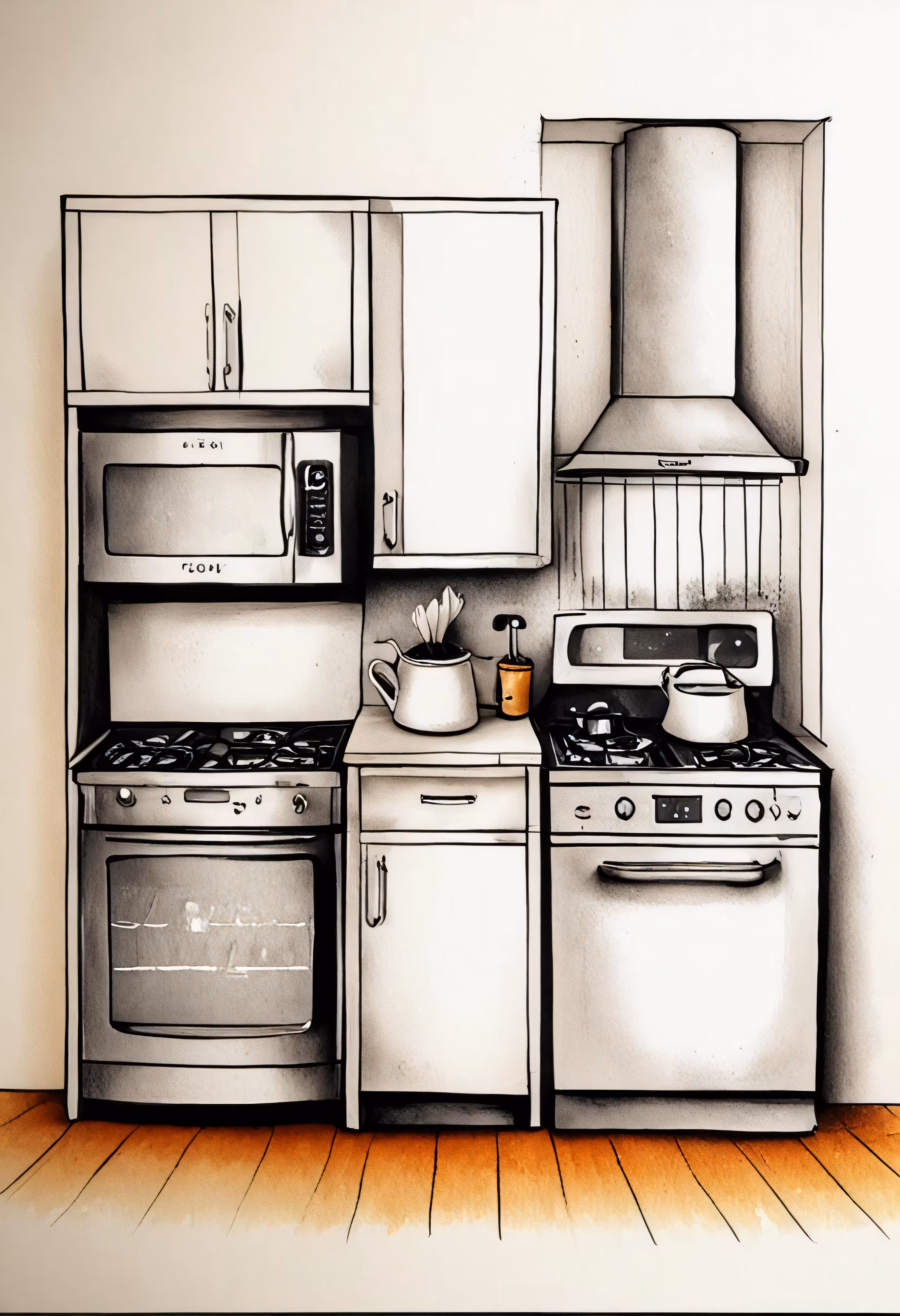 High resolution picture, free to use, a line drawing of a kitchen scene with pots and pans