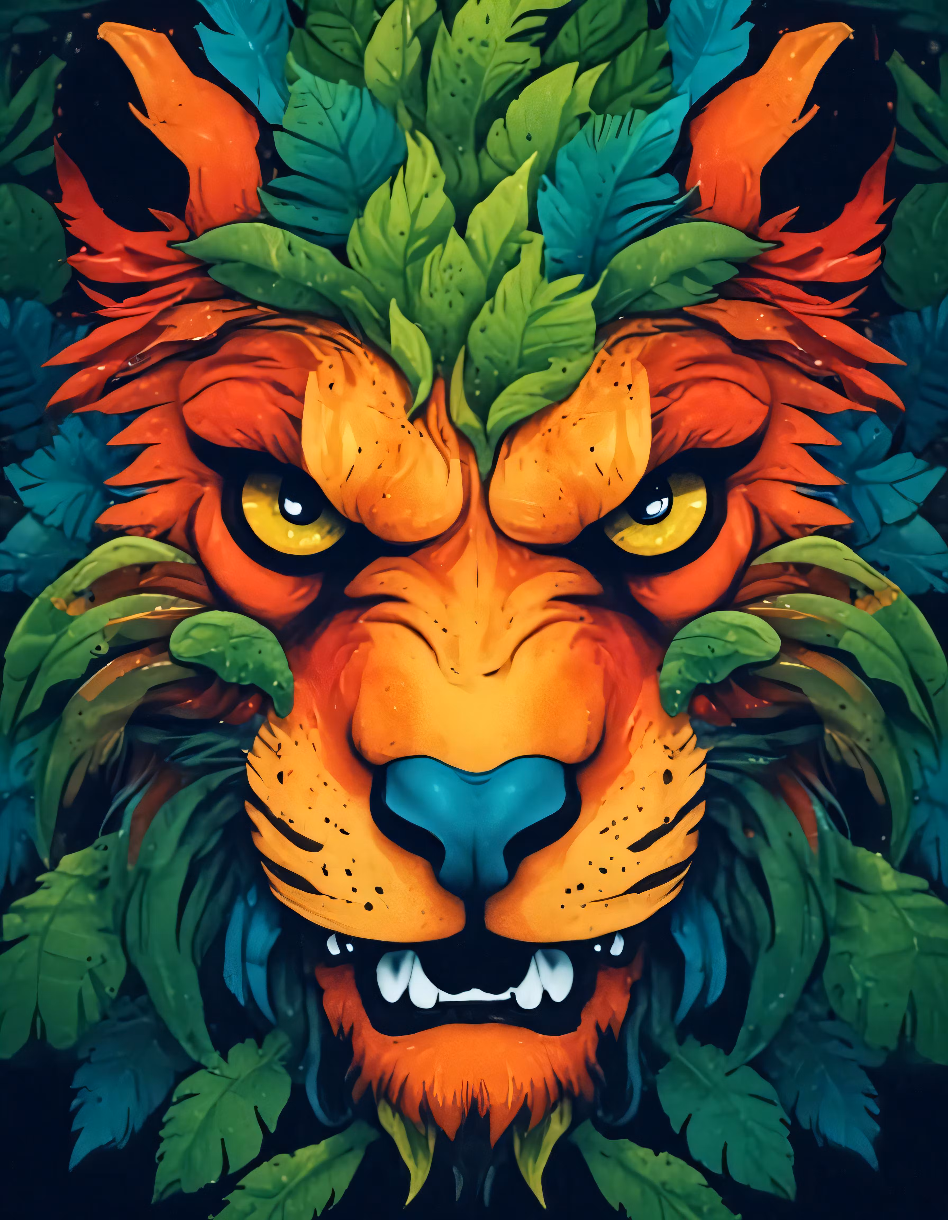 High resolution picture, free to use, a lion head with leaves in its mane