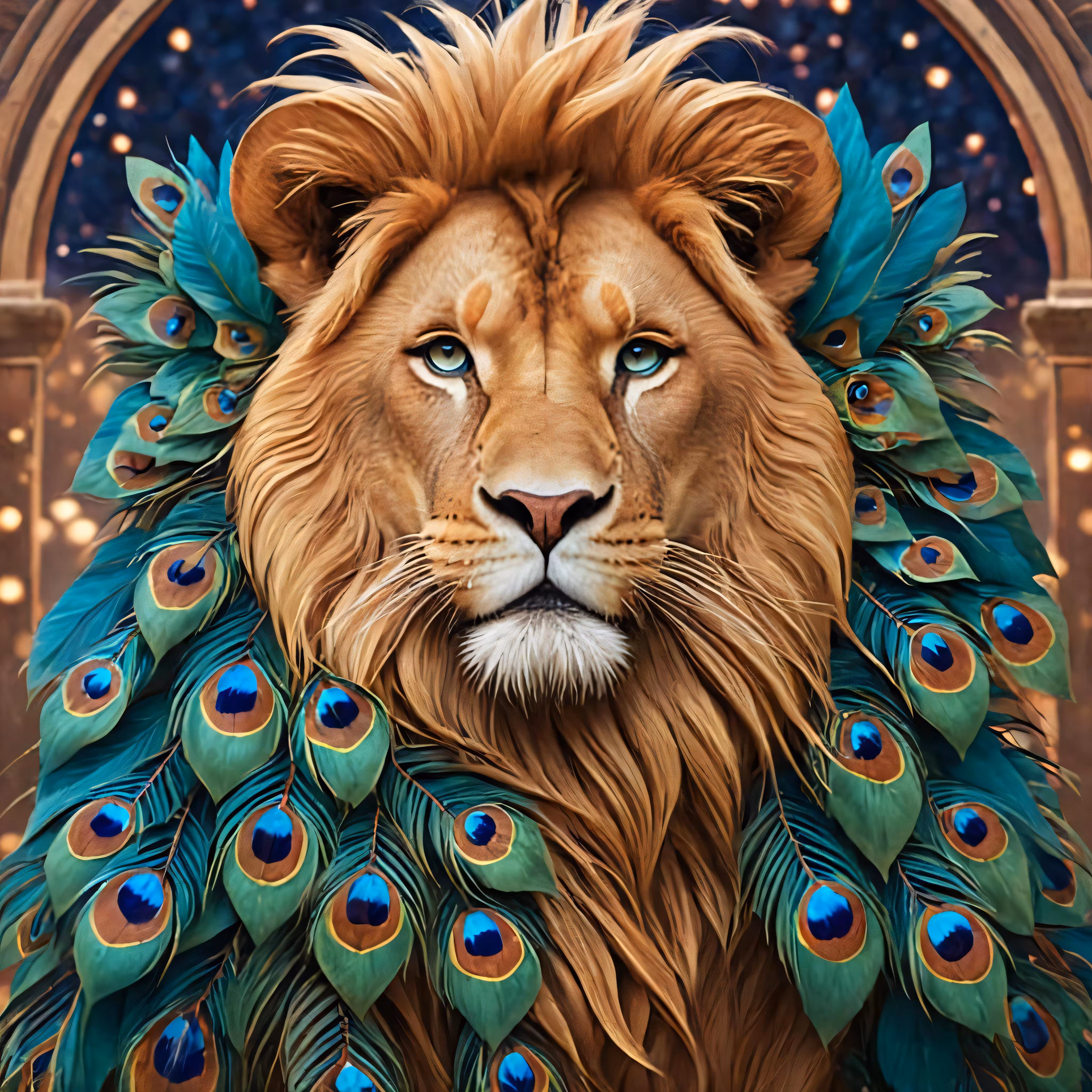 High resolution picture, free to use, a lion with lots of feathers standing on a stage