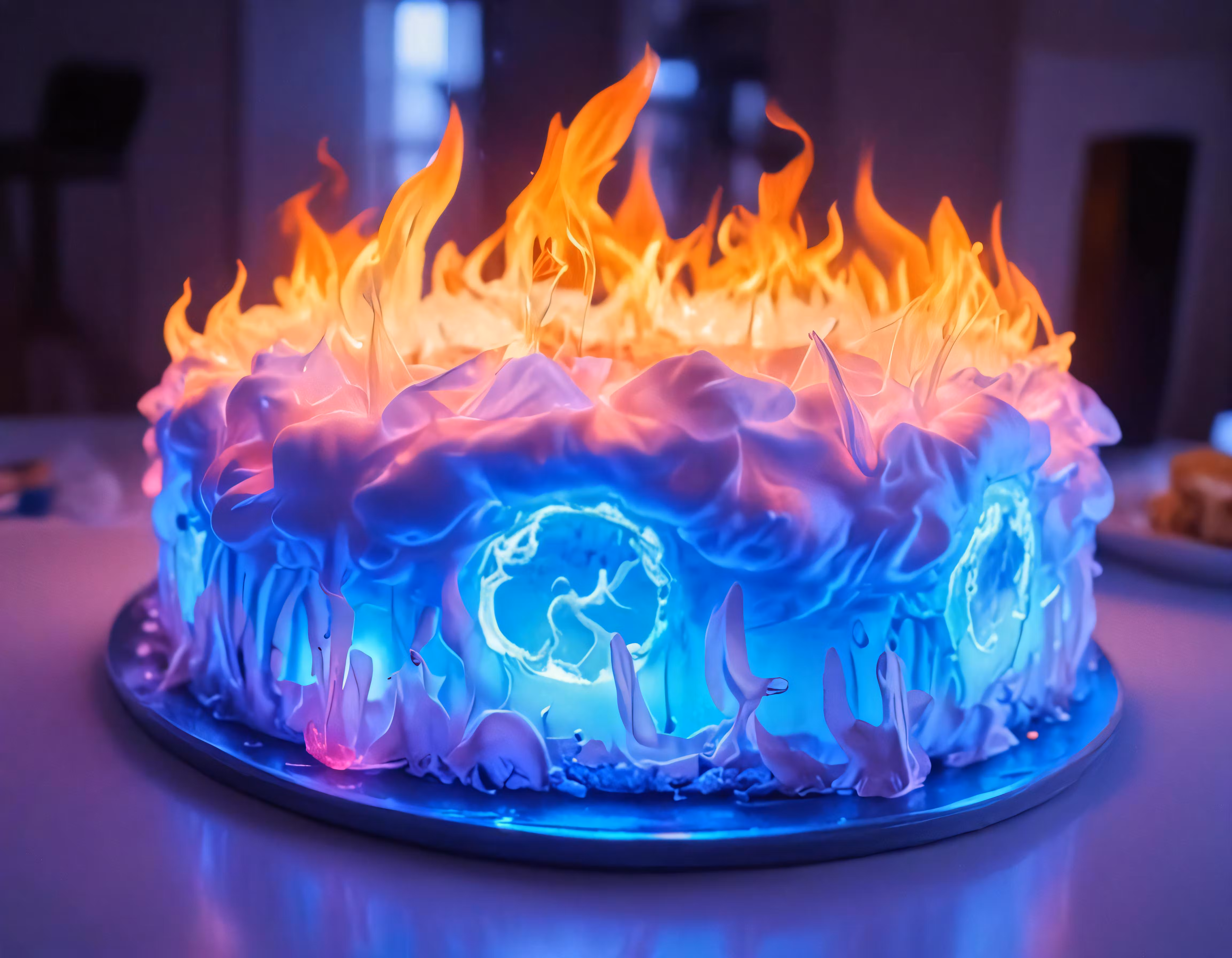 High resolution picture, free to use, a lit fire cake on a metal platter
