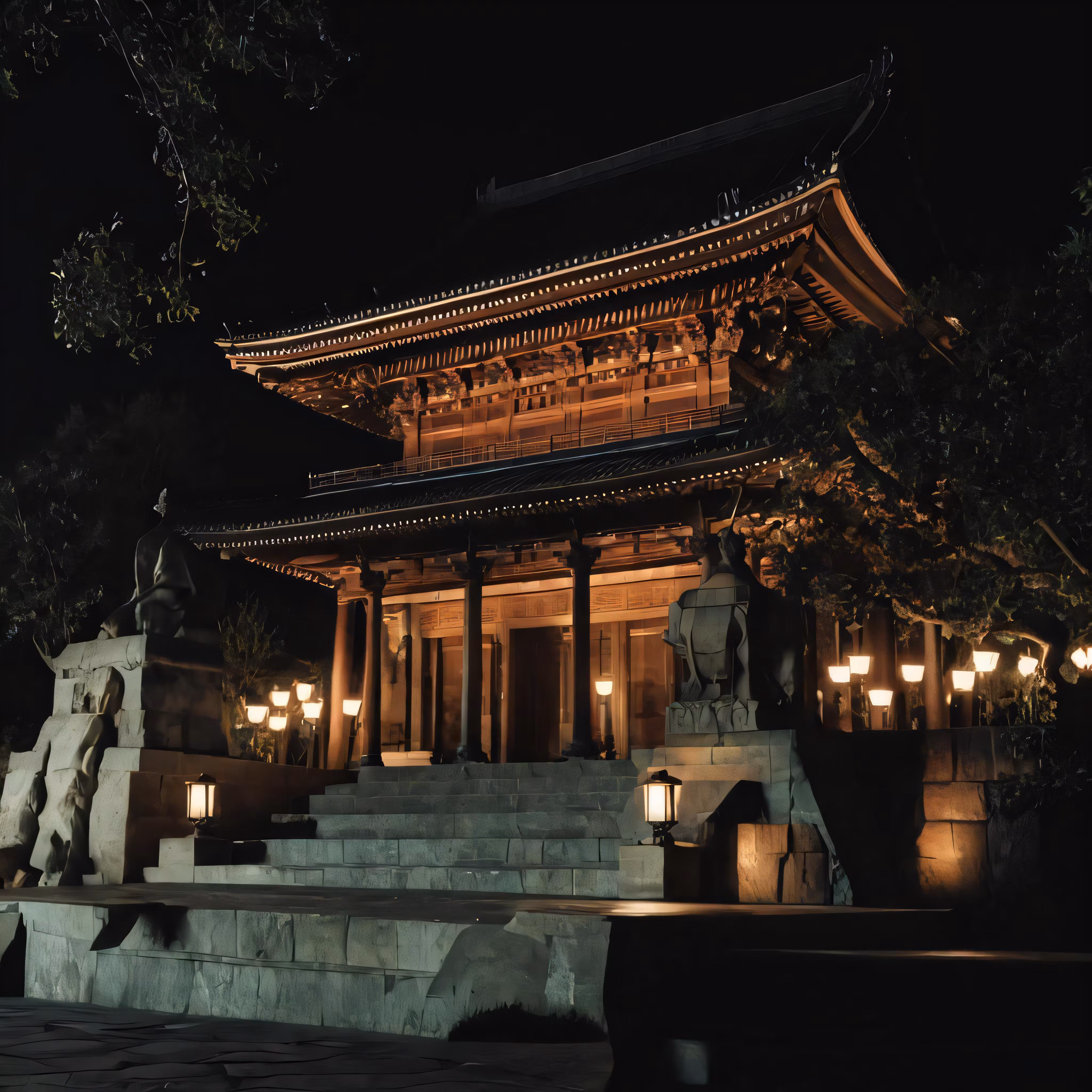 High resolution picture, free to use, a lit up temple by some light posts