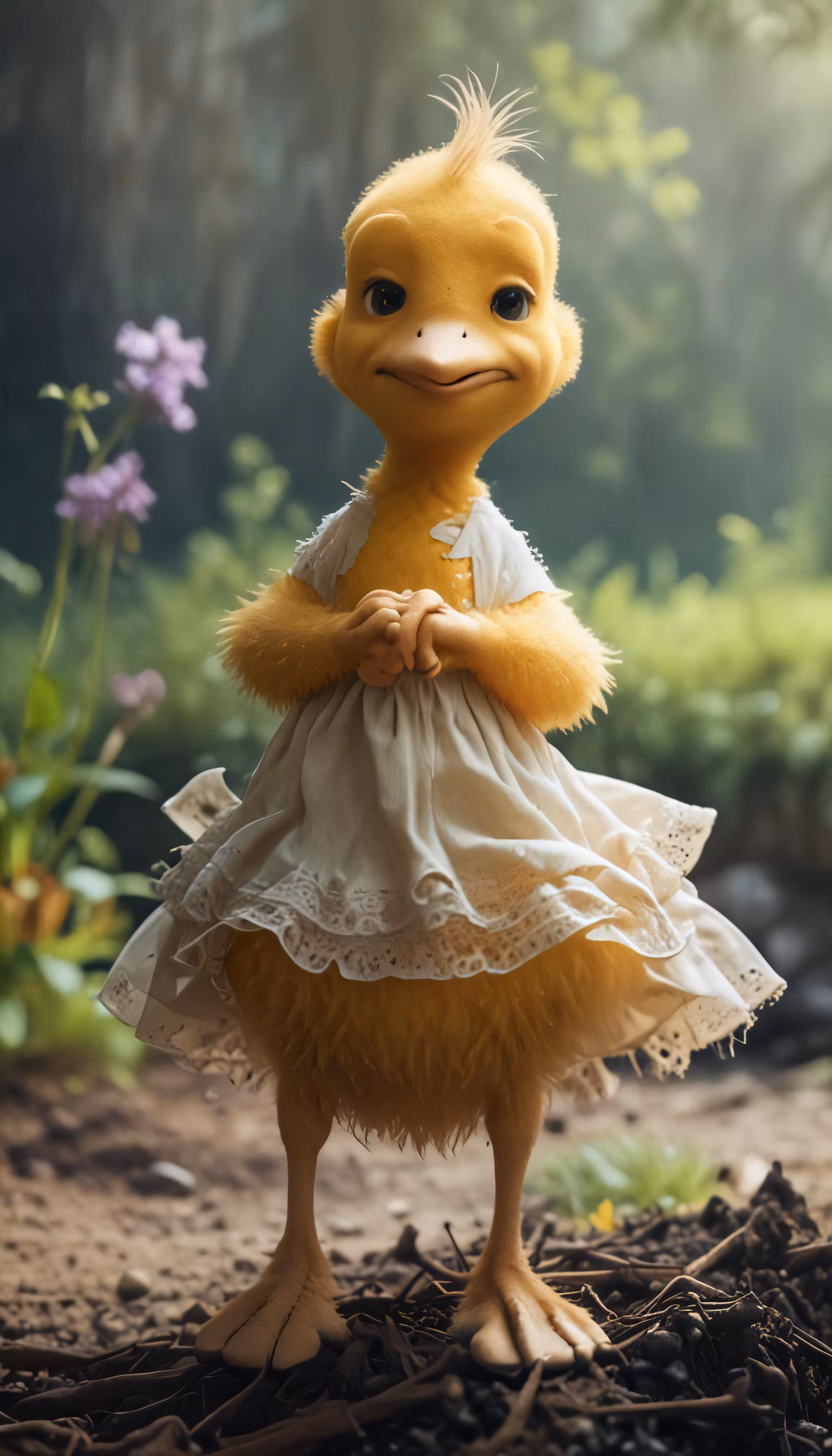 High resolution picture, free to use, a little bird in a dress standing on a pile of debris