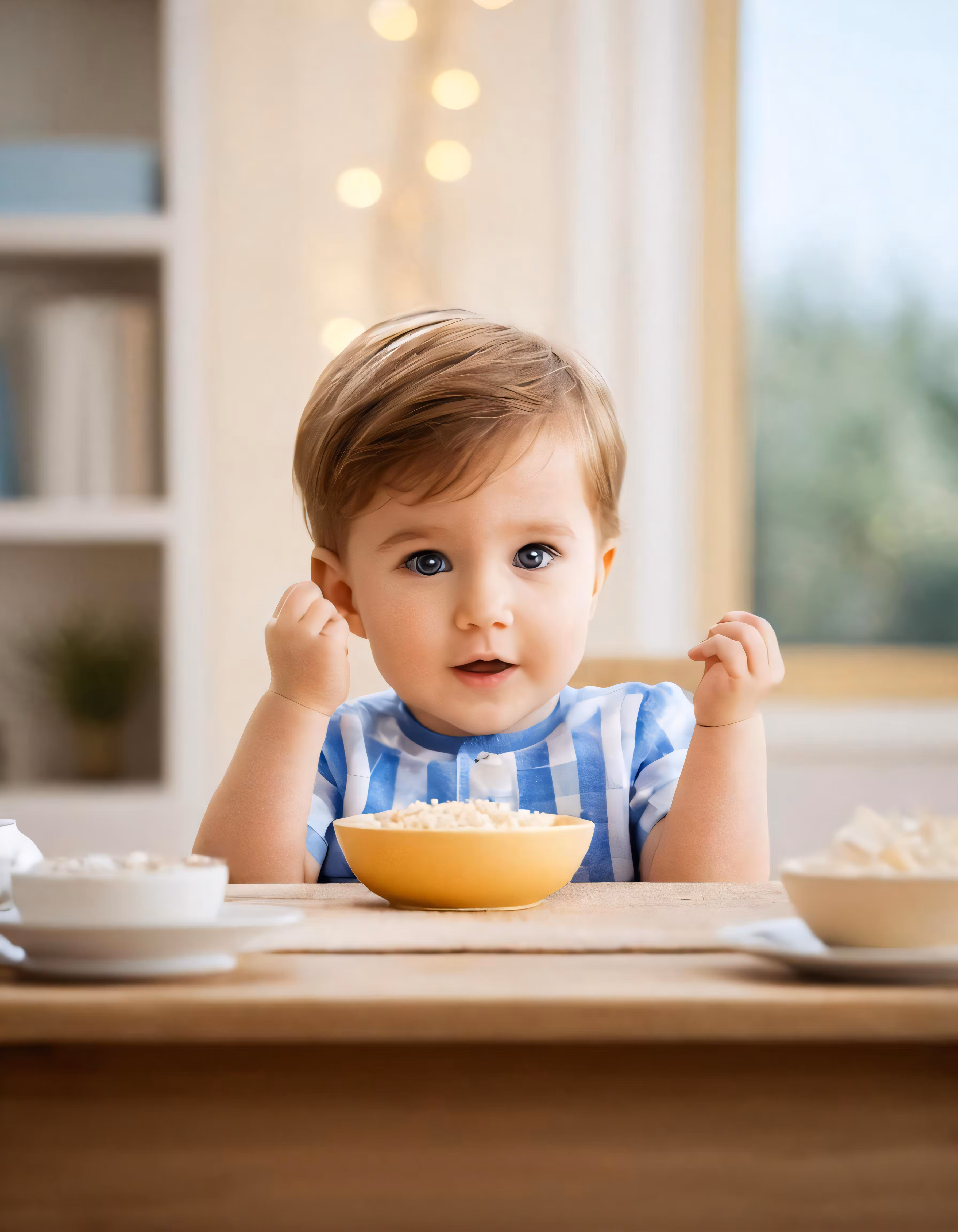High resolution picture, free to use, a little boy sitting at a table with a bowl of oatmeal