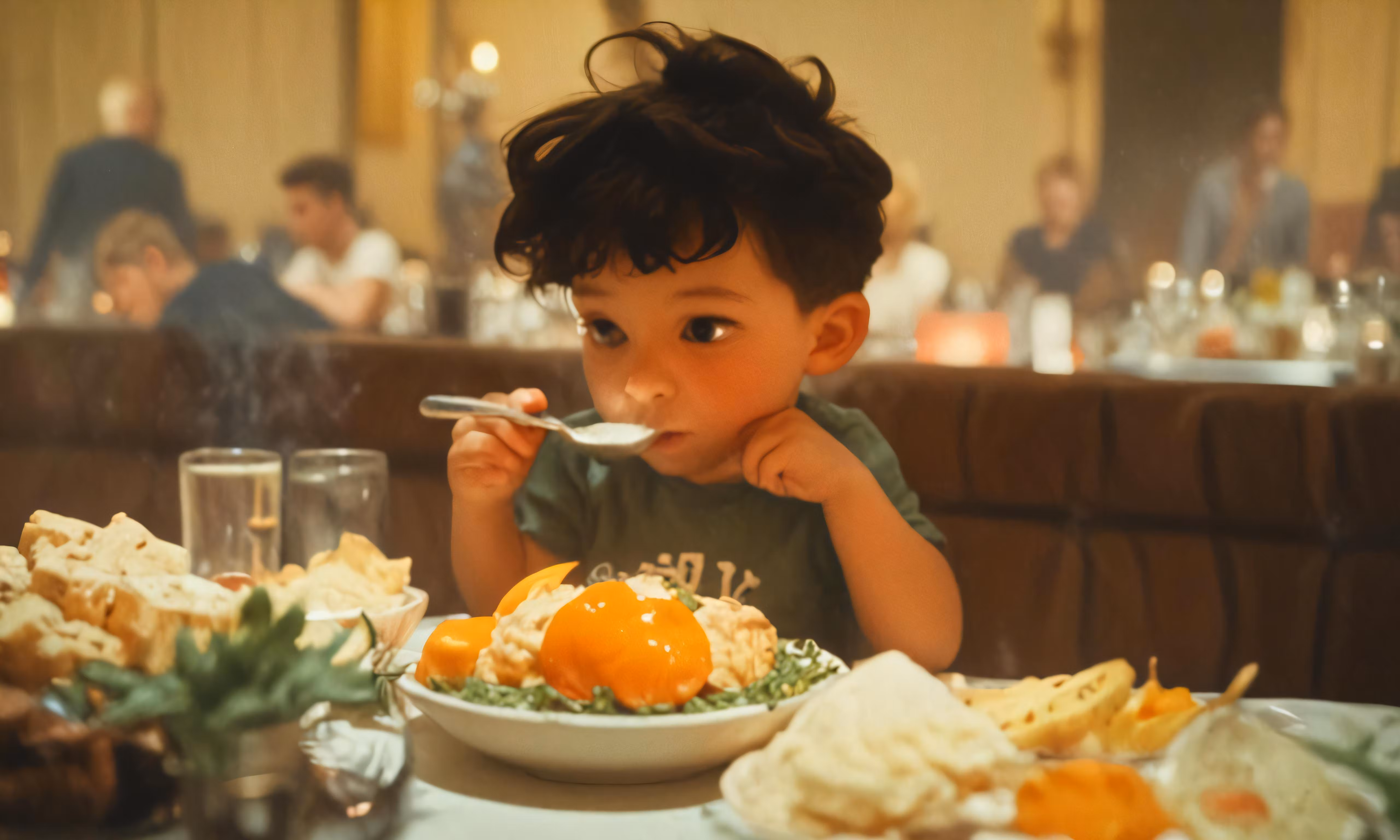 High resolution picture, free to use, a little boy sitting at a table with food in front of him