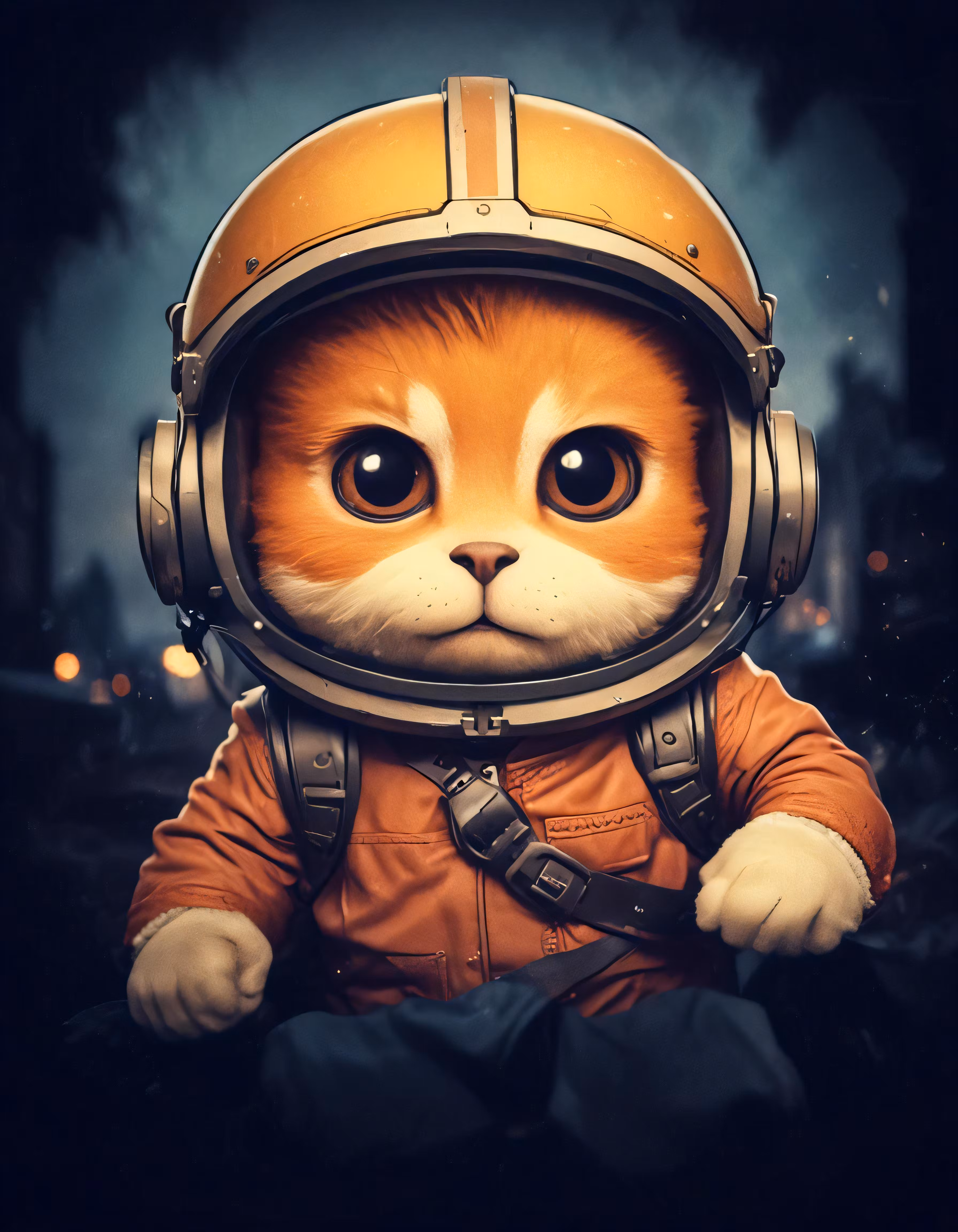High resolution picture, free to use, a little cat wearing a space suit with an orange helmet