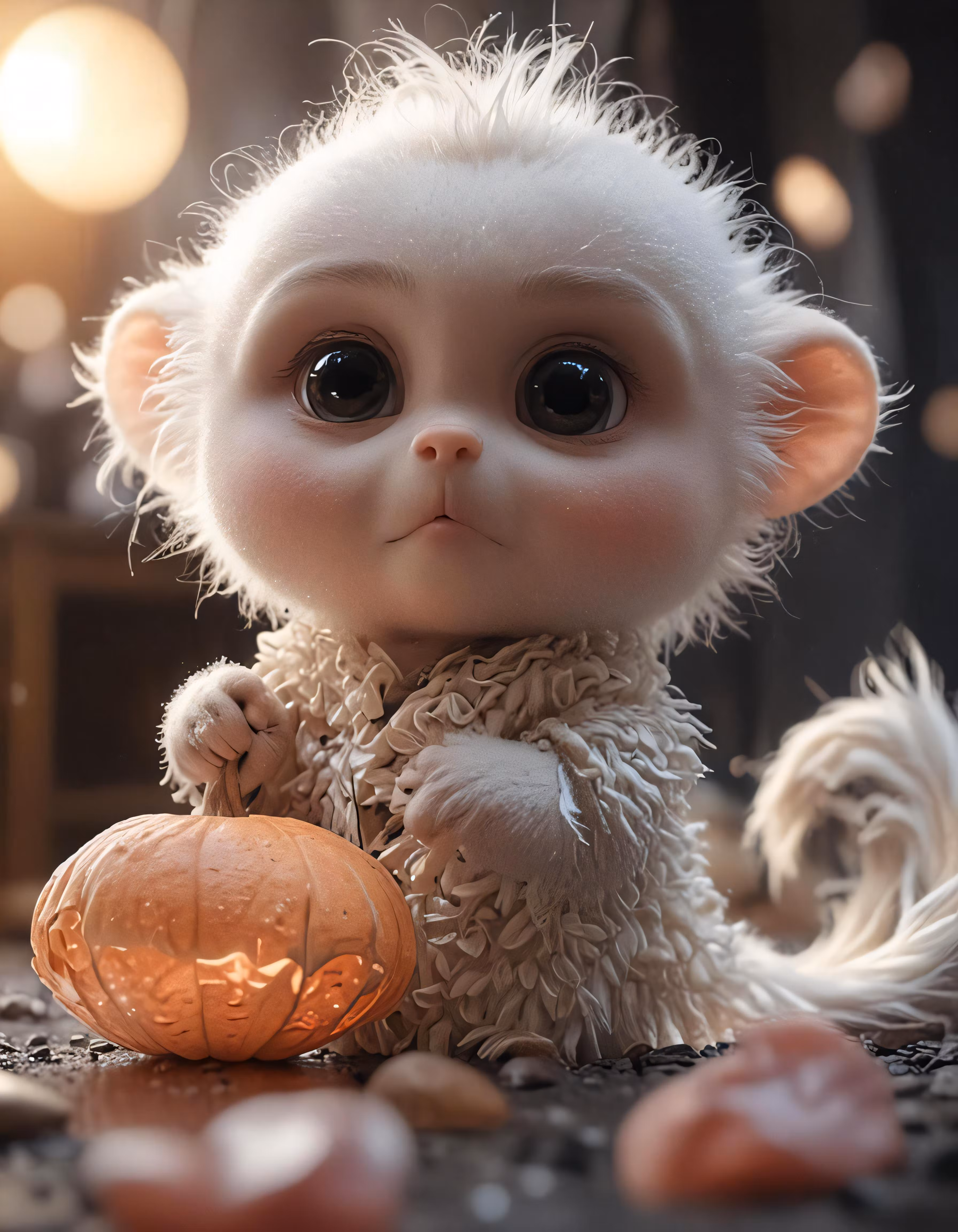 High resolution picture, free to use, a little furry creature holding a small pumpkin