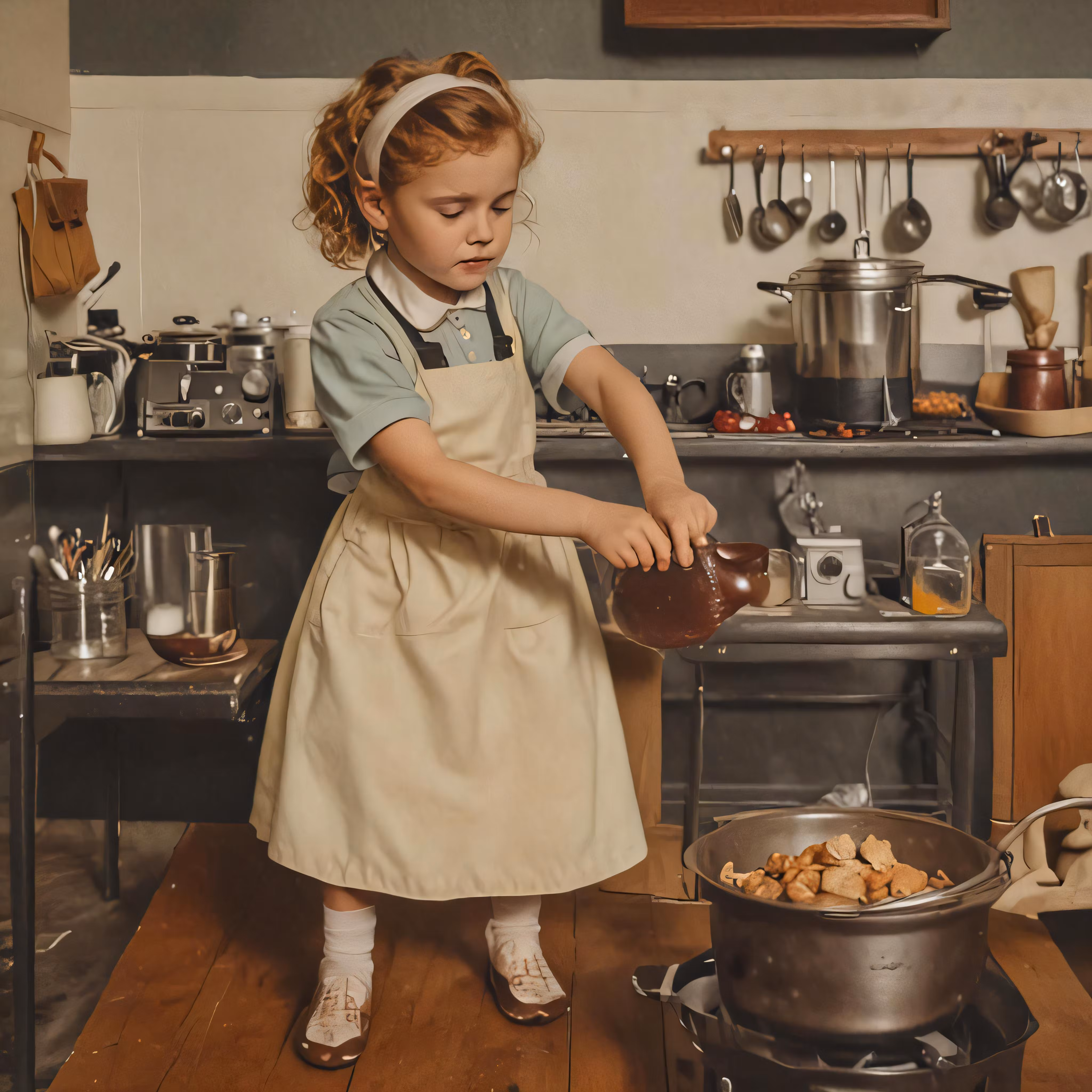 High resolution picture, free to use, a little girl in a kitchen with a pot and pan