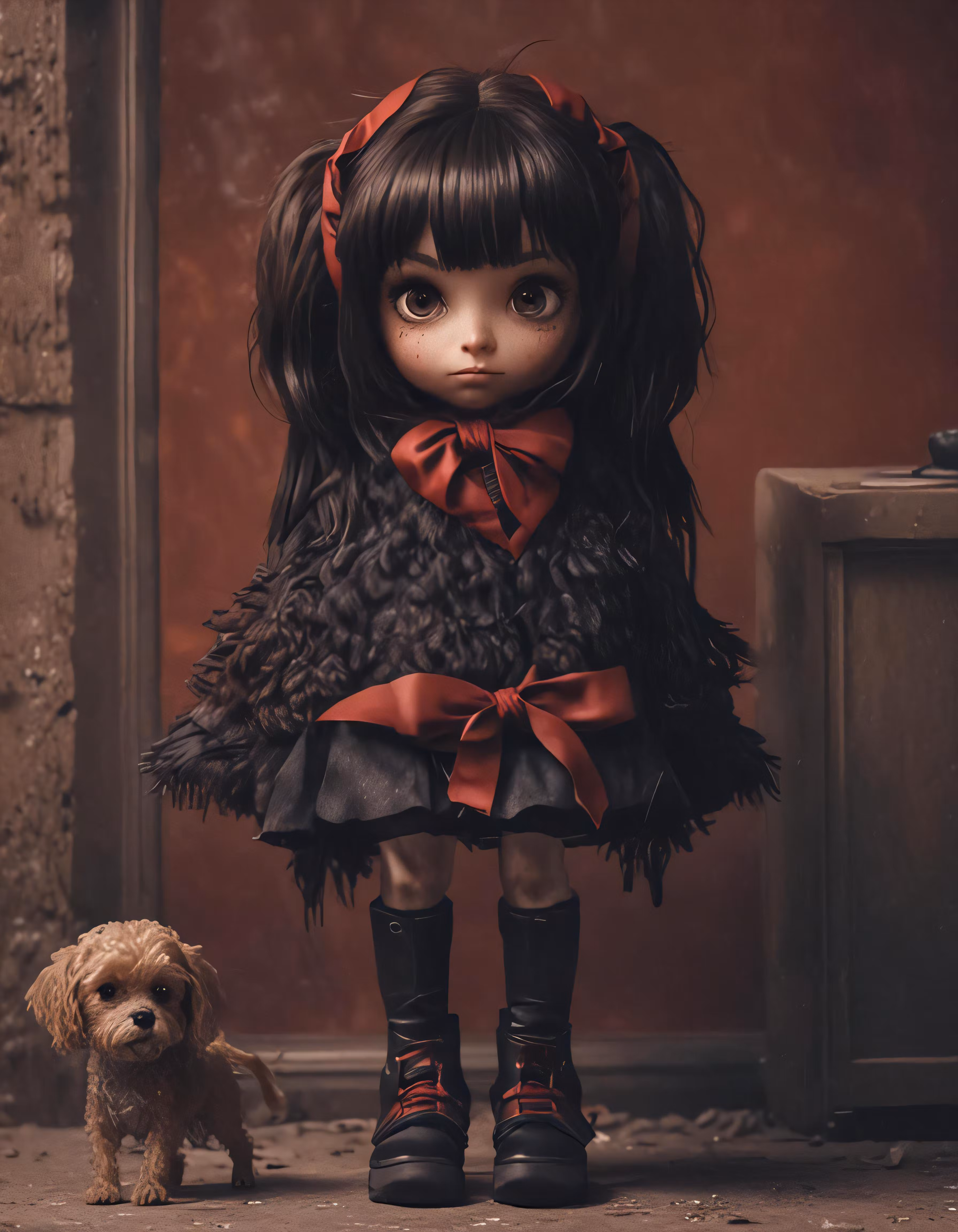 High resolution picture, free to use, a little girl in black dress and boots next to a dog