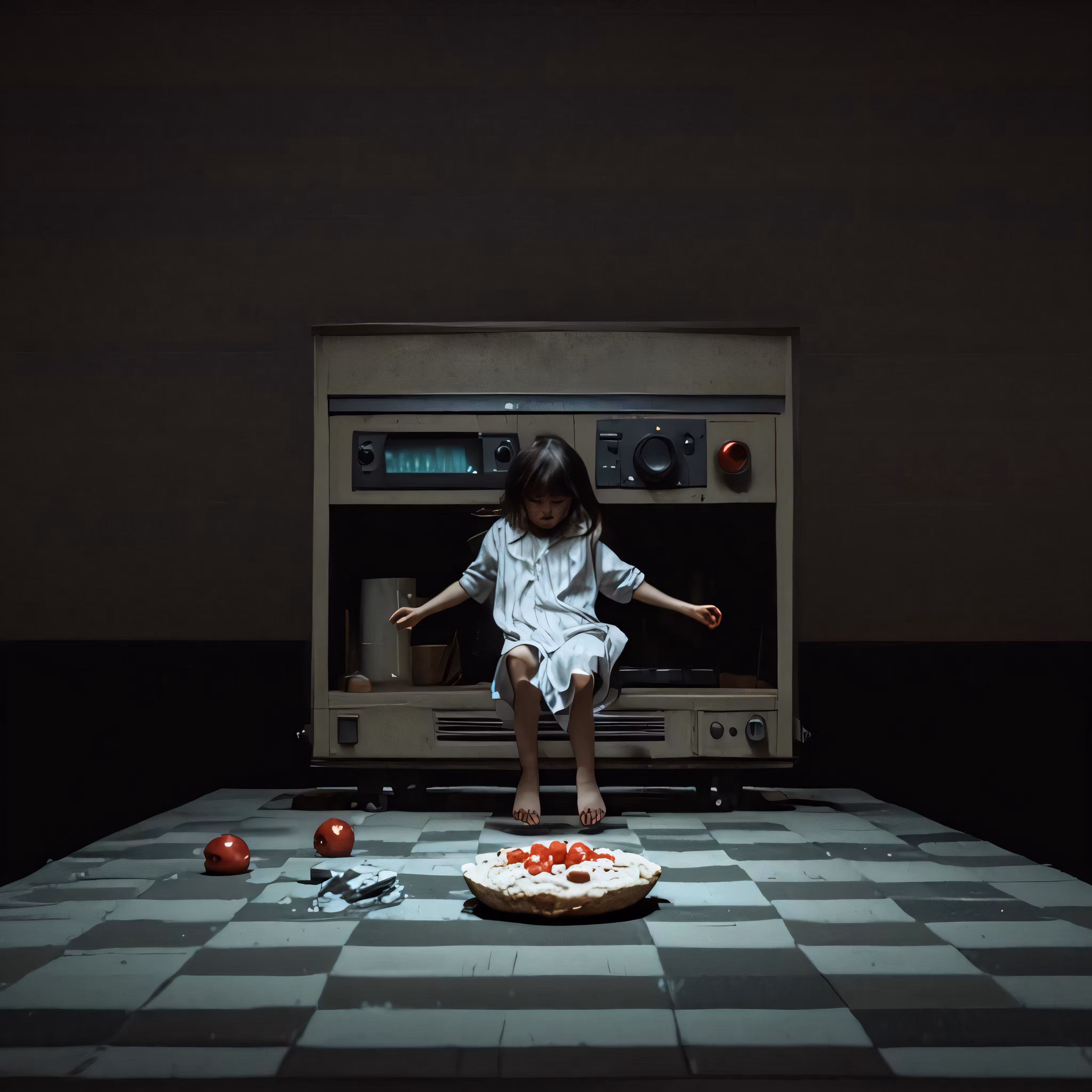 High resolution picture, free to use, a little girl is sitting in front of an oven with a pizza on the floor