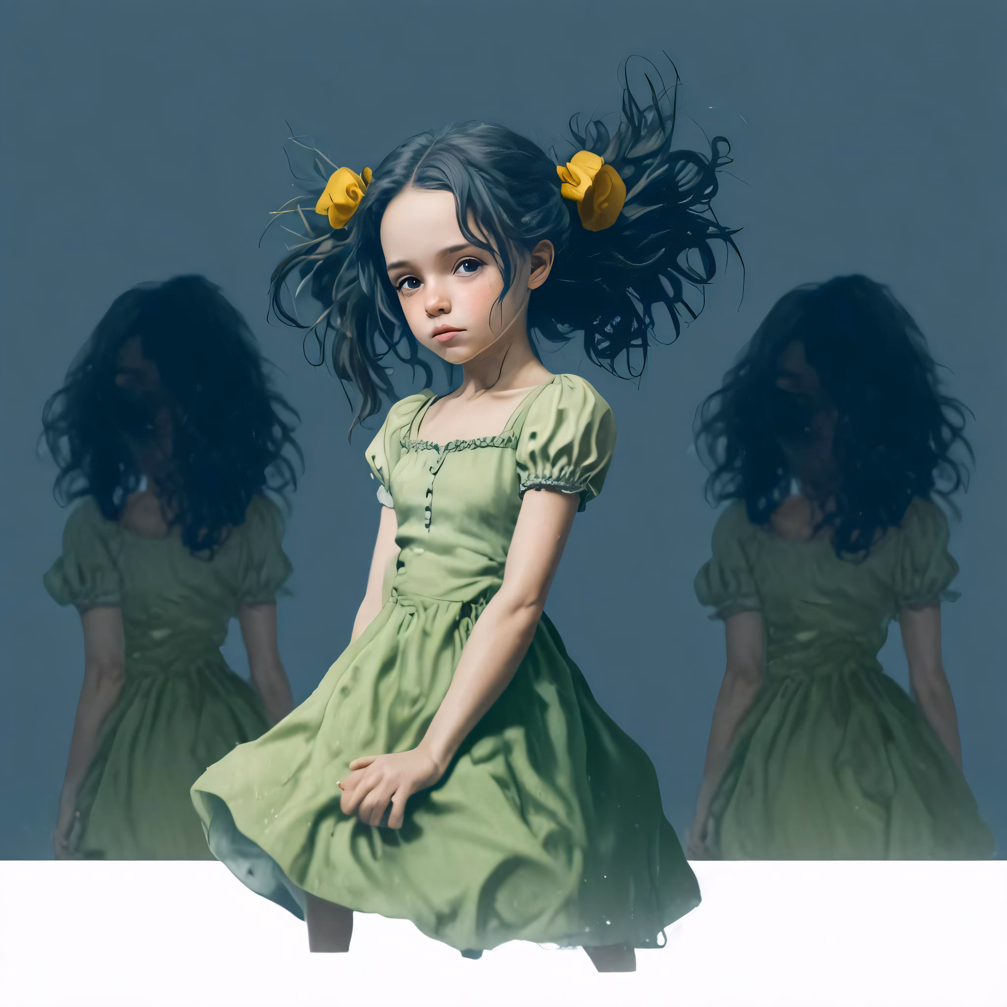 High resolution picture, free to use, a little girl posing in front of two girls, wearing green dresses