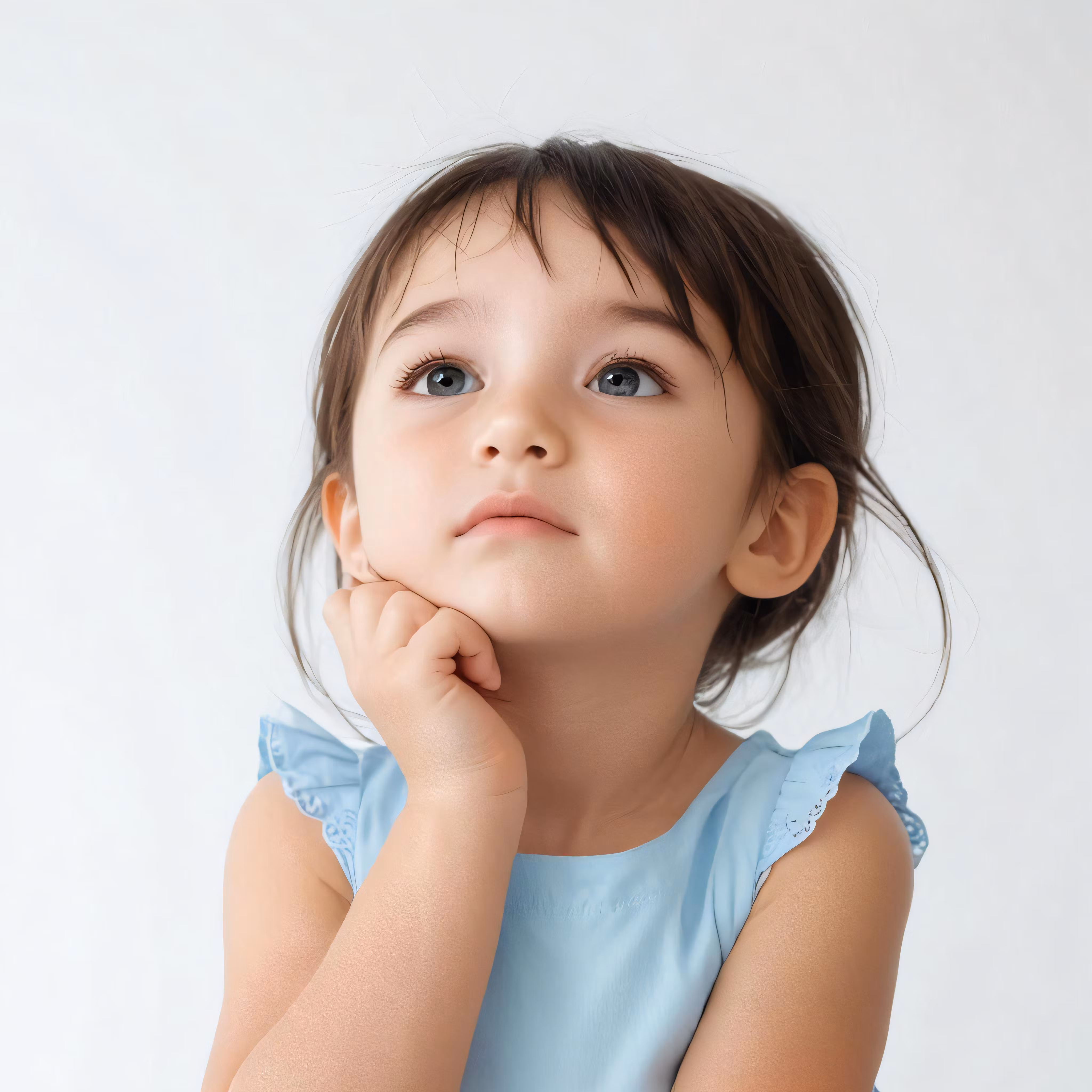 High resolution picture, free to use, a little girl sitting and looking up while holding her hand on her cheek