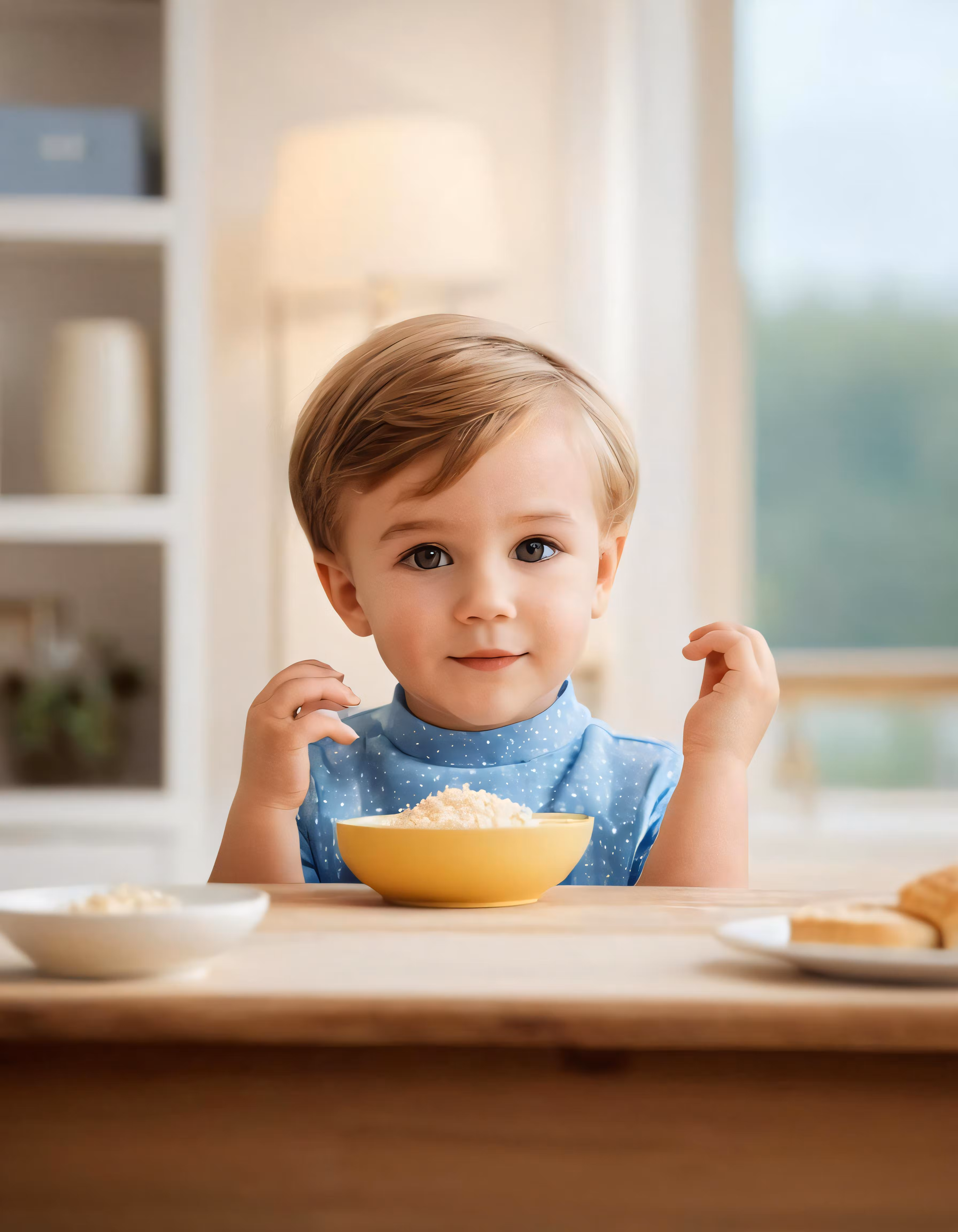 High resolution picture, free to use, a little girl sitting in front of a bowl of food