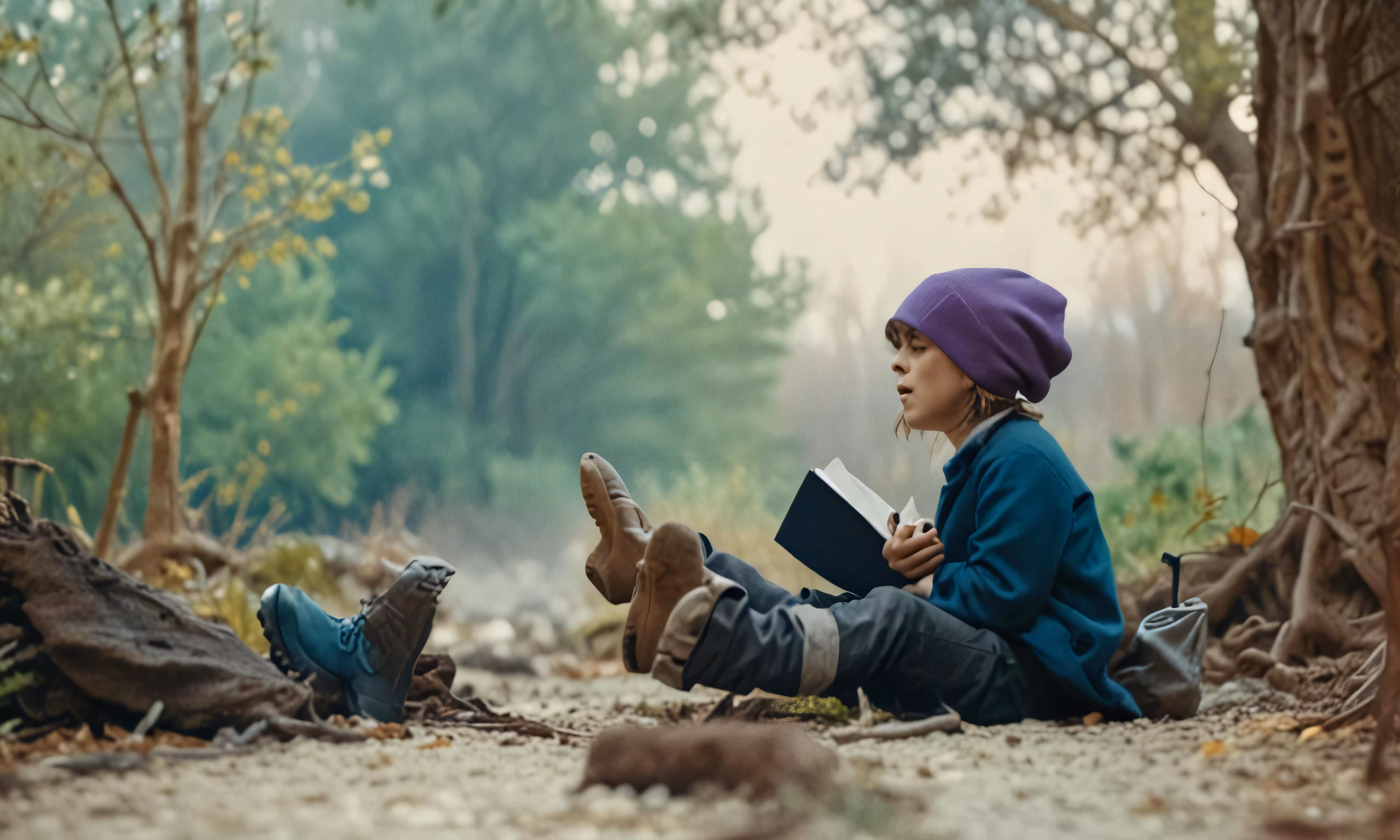 High resolution picture, free to use, a little girl sitting in the woods reading a book