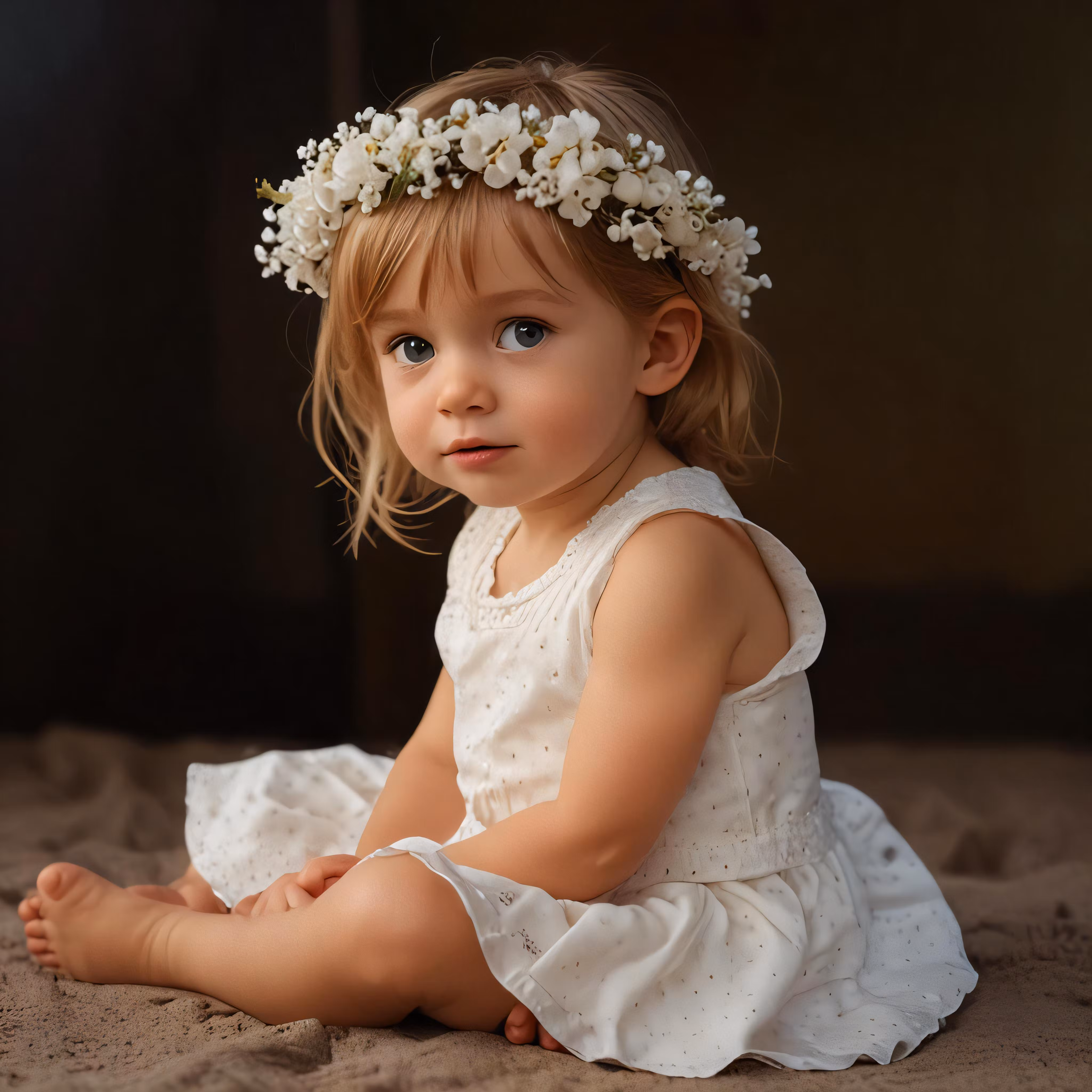 High resolution picture, free to use, a little girl sitting on top of sand in a dress