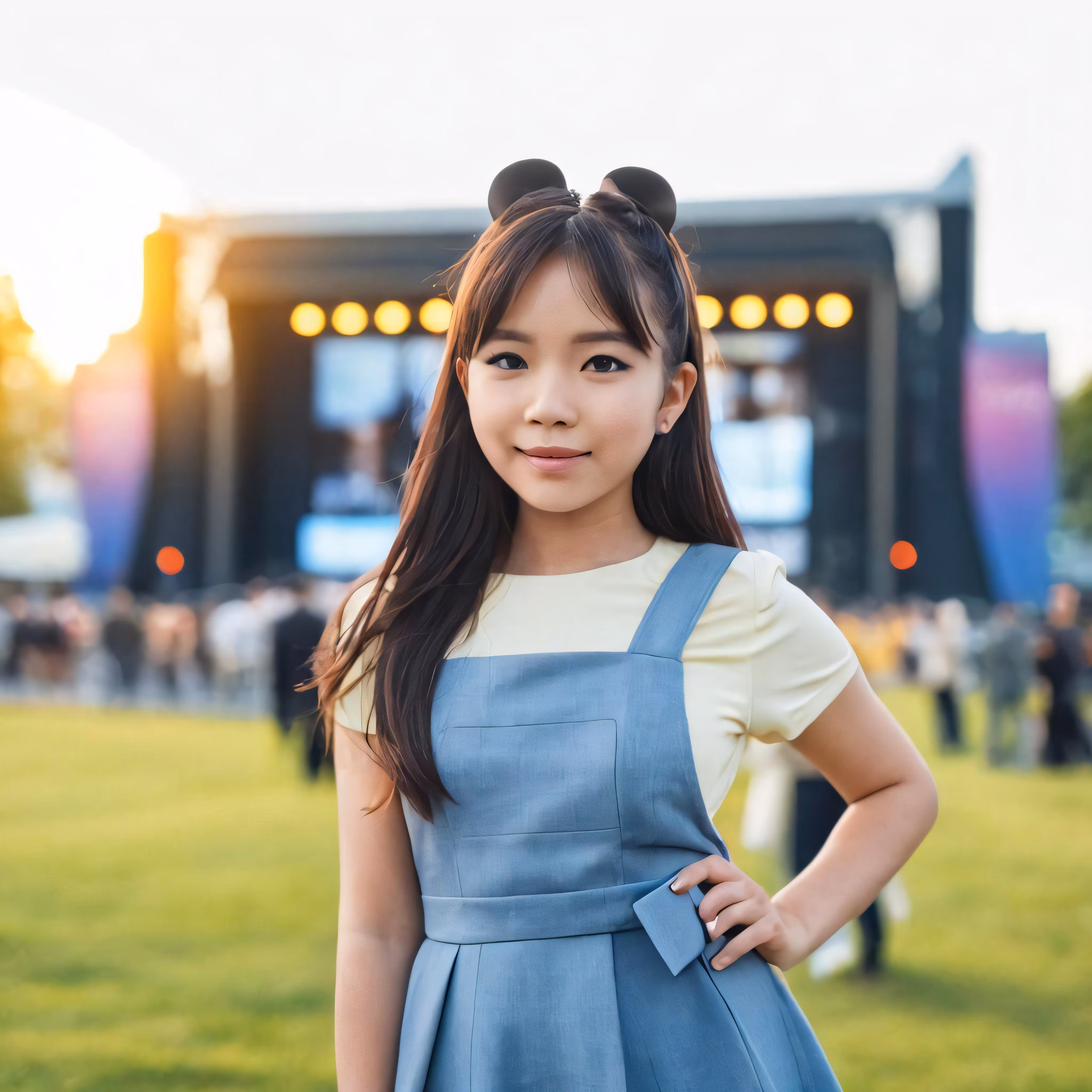 High resolution picture, free to use, a little girl standing on the grass in front of a stage